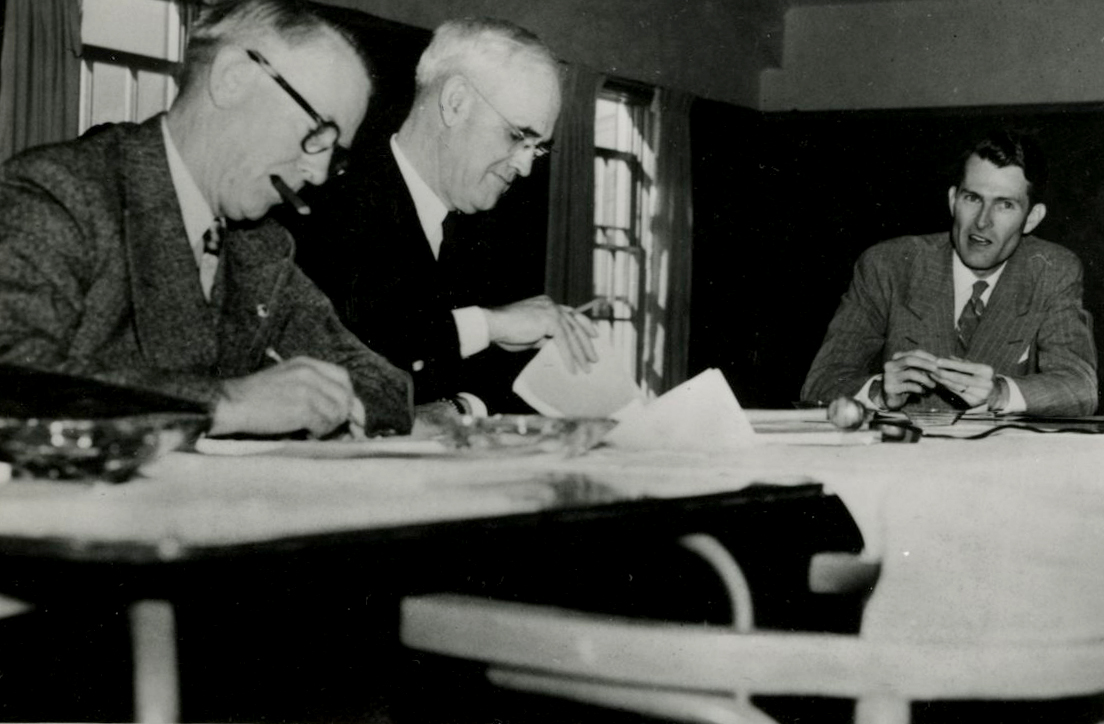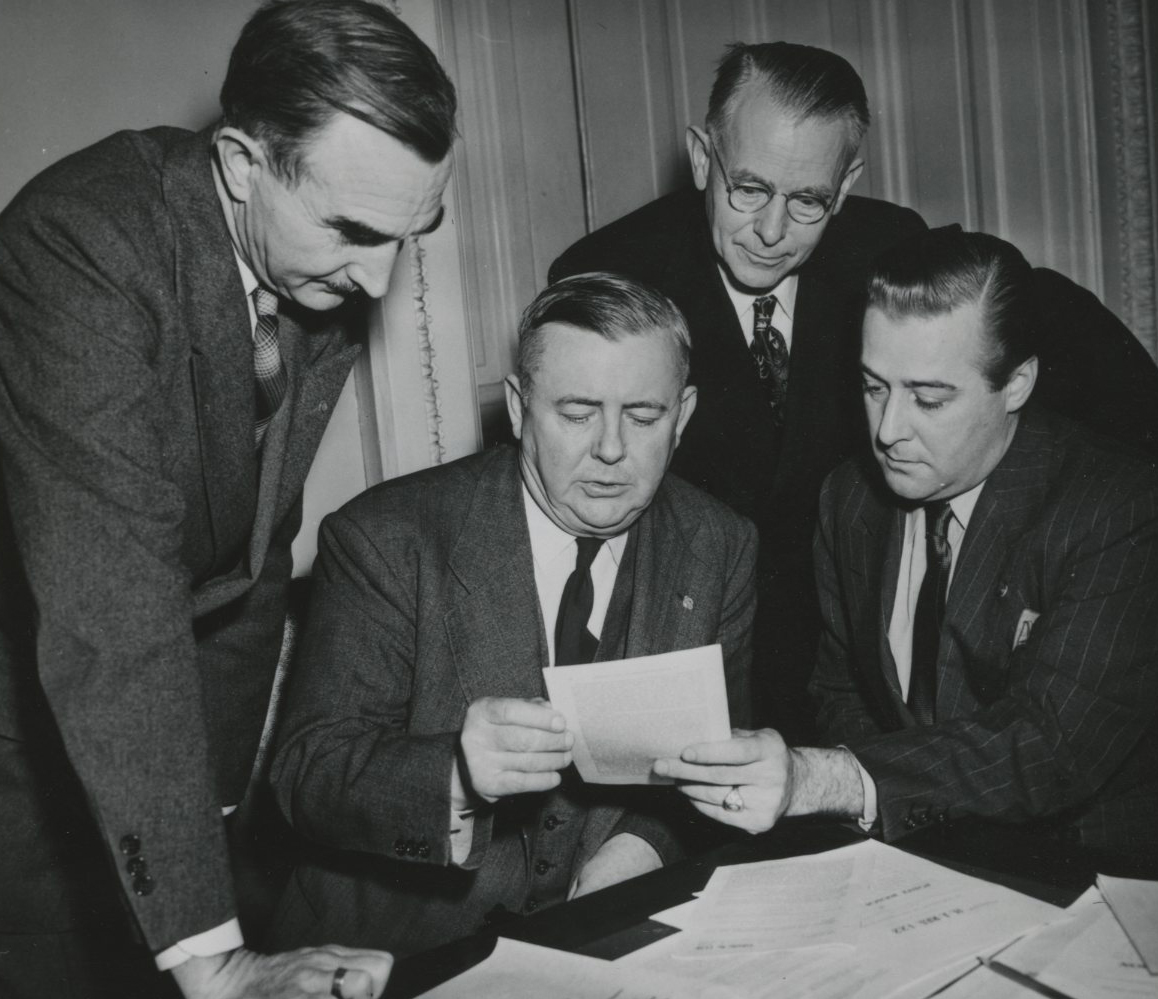 Joseph Carson (seated center), Wayne Morse, Condon, and Sen. Warren Magnuson (WA) discuss Carson's appt to Maritime Commission, 1947.