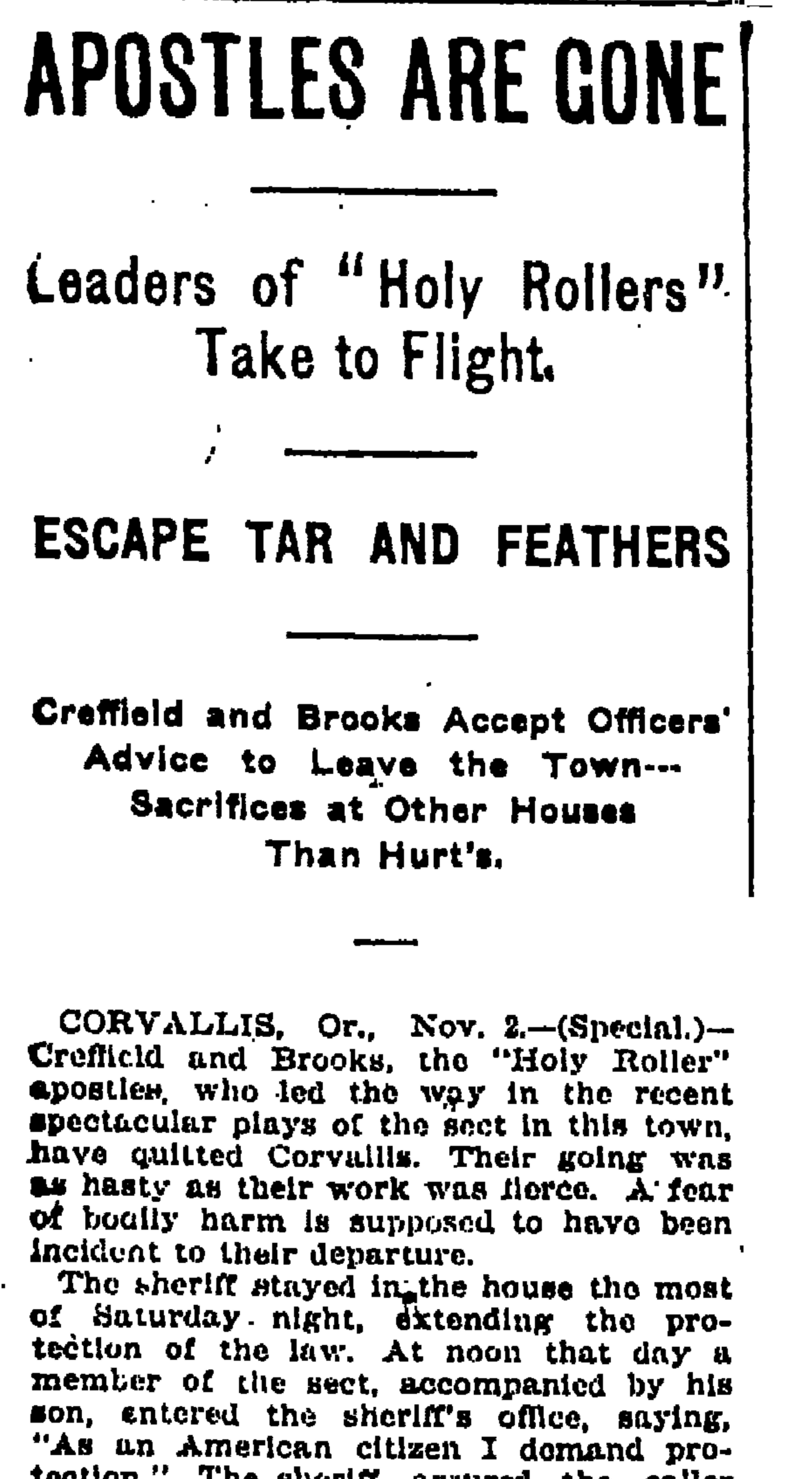 "Apostles are Gone: Leaders of Holy Rollers Take to Flight," Morning Oregonian, Nov. 3, 1903.
