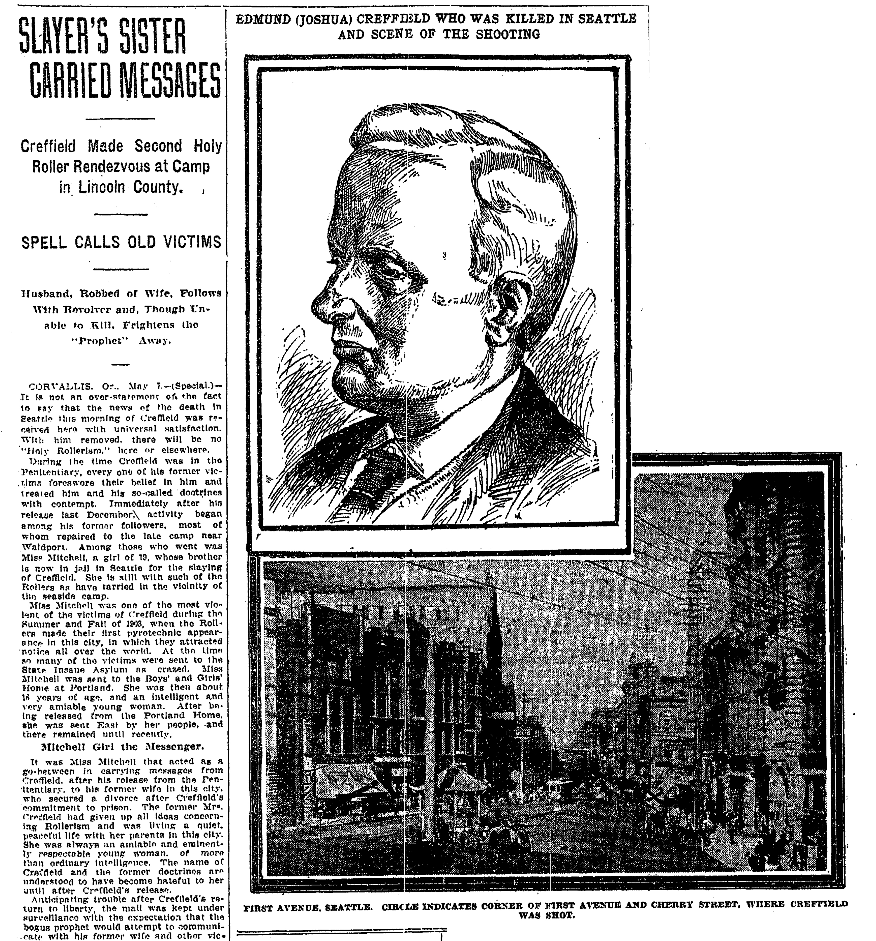 Hartley was only one of several men gunning for Creffield. Creffield and Maud Hurt left his group of followers at a camp near Yachats, telling them that the couple was going to British Columbia to establish a colony. George Mitchell, Donna Starr’s brother, tracked them to Seattle and killed Creffield in front of witnesses. Mitchell pleaded not guilty by reason of insanity.