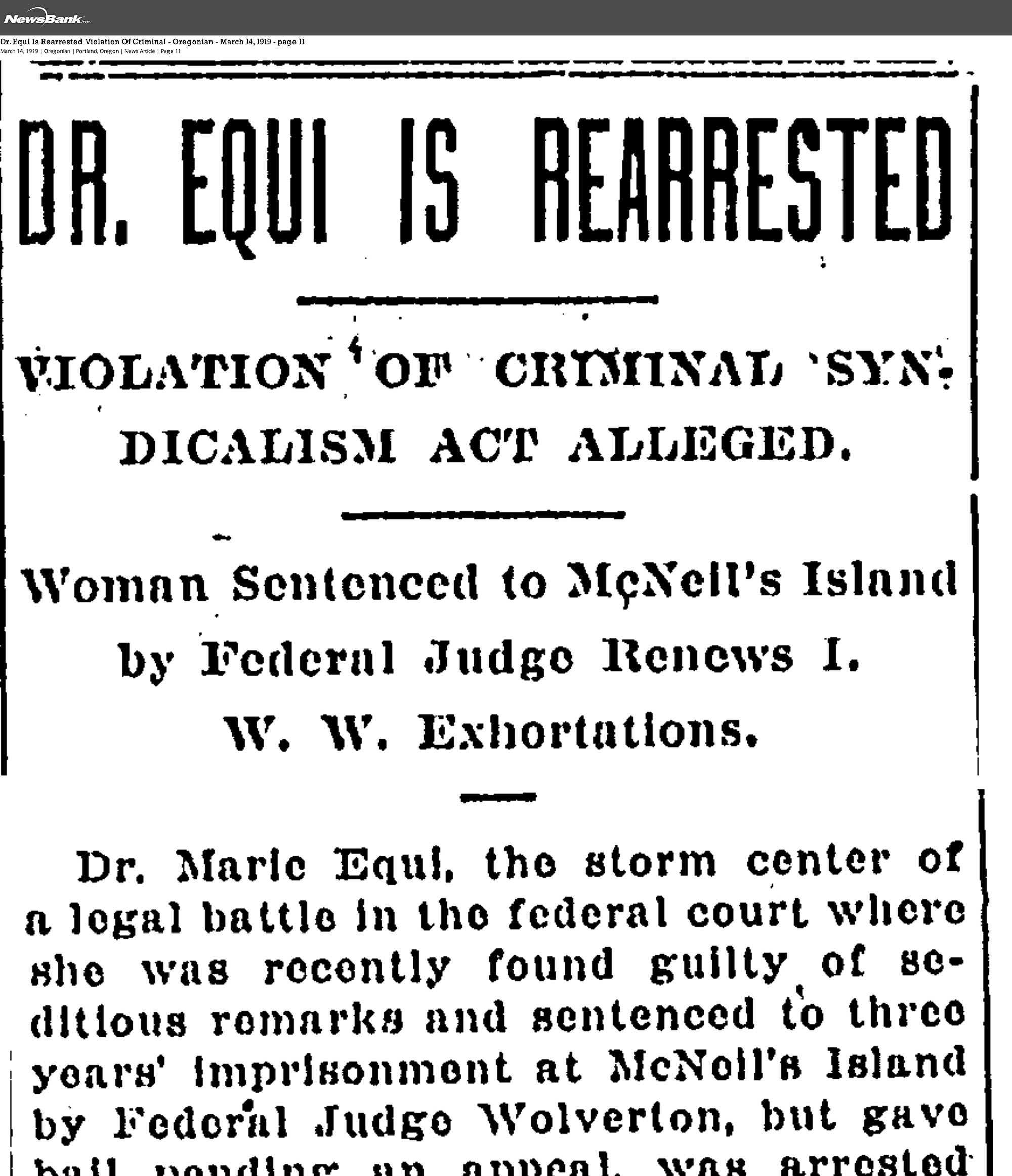 "Dr. Equi is Rearrested," Oregonian, March 14, 1919.