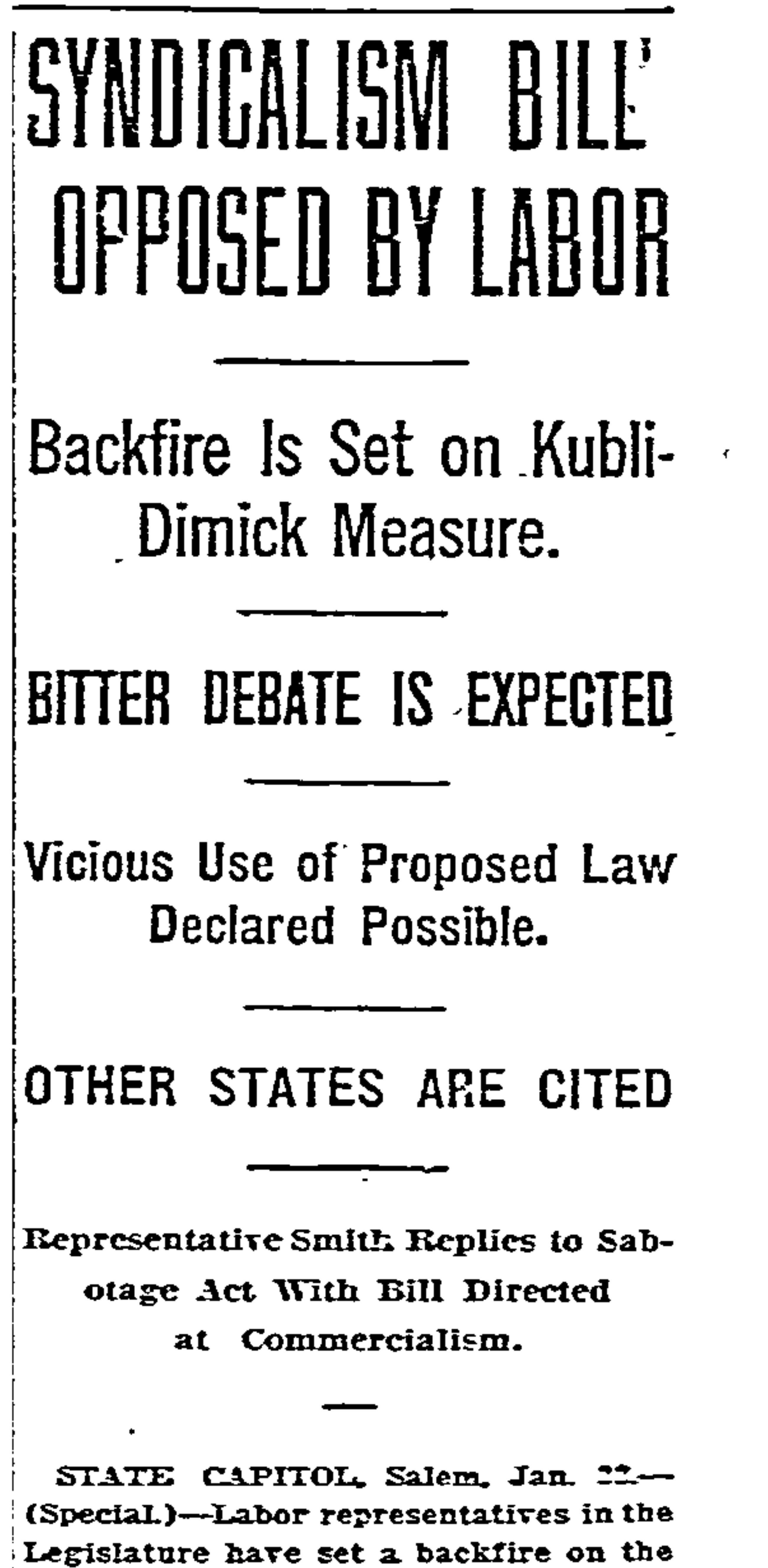 "Syndicalism Bill Opposed by Labor," Oregonian, January 23, 1919.