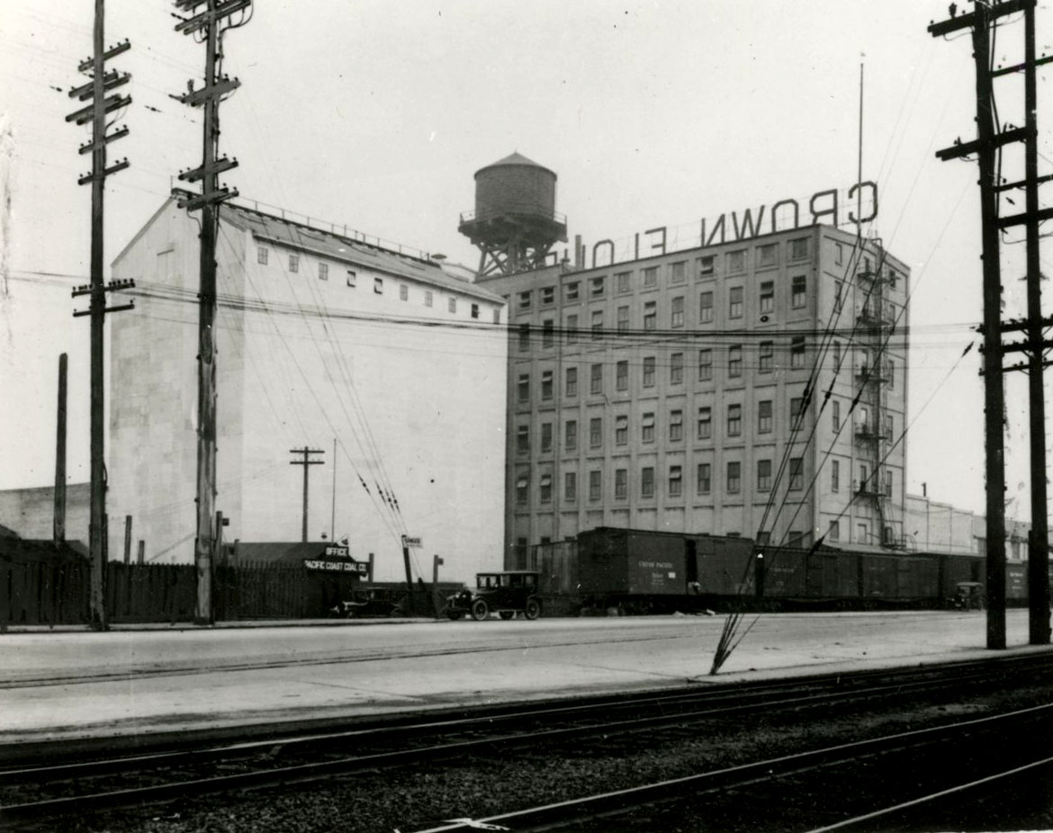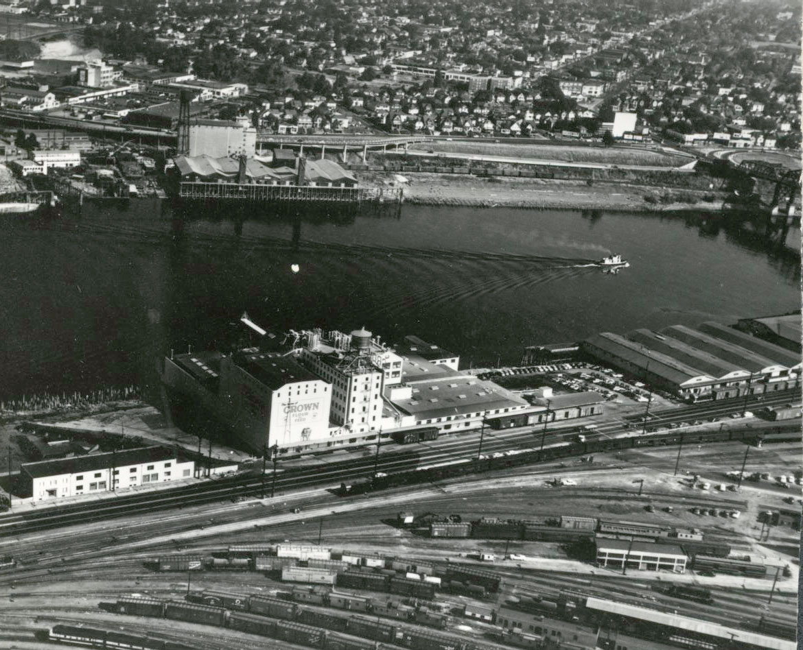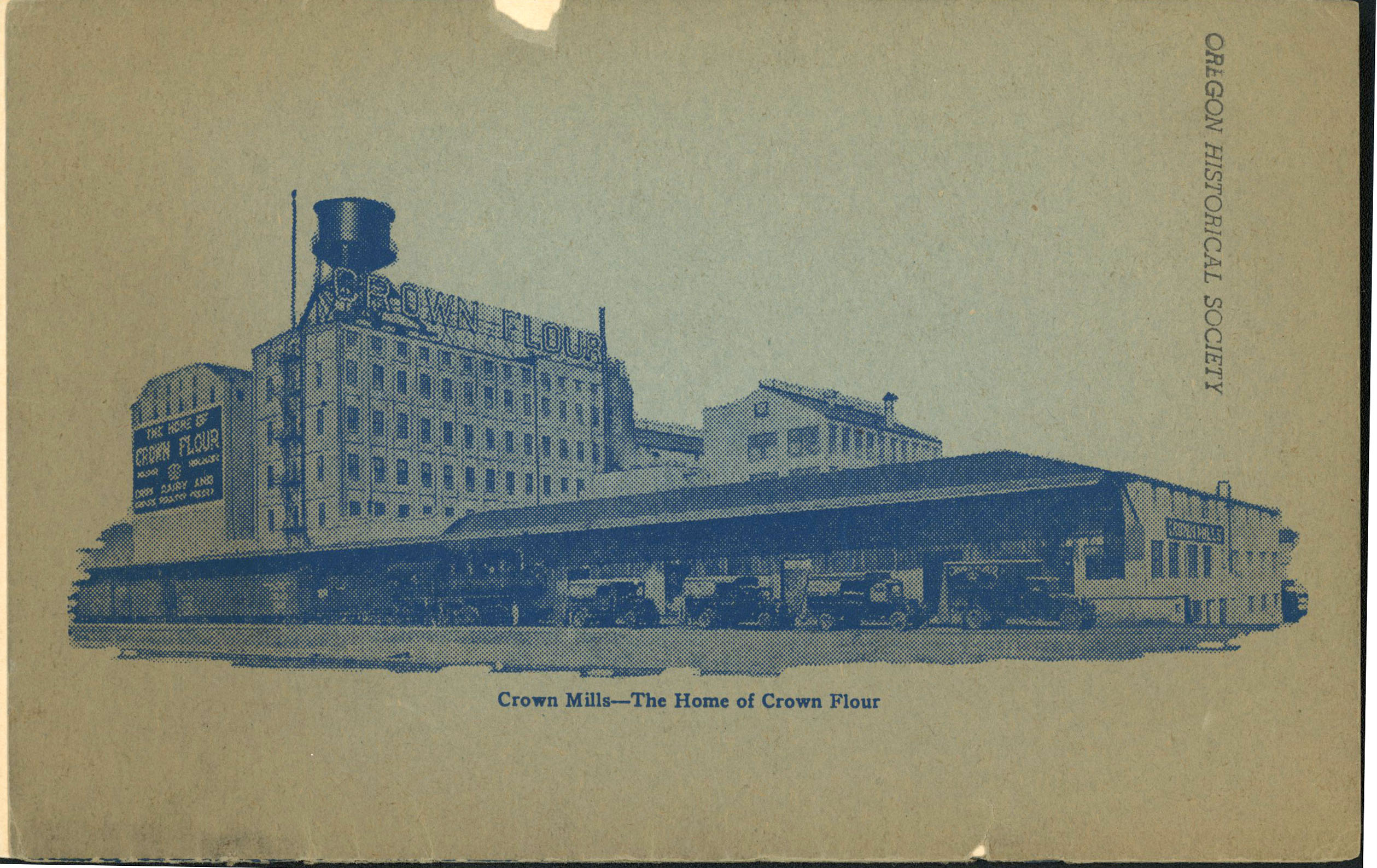 For eighty years, Crown Mills, known as Centennial Mills after 1949, was one of the largest producers of flour and milled grain in the Pacific Northwest. The original mill was built in 1910 on a site adjacent to the Willamette River in Portland, facing what is now Northwest Naito Parkway at the foot of Pettygrove Street.