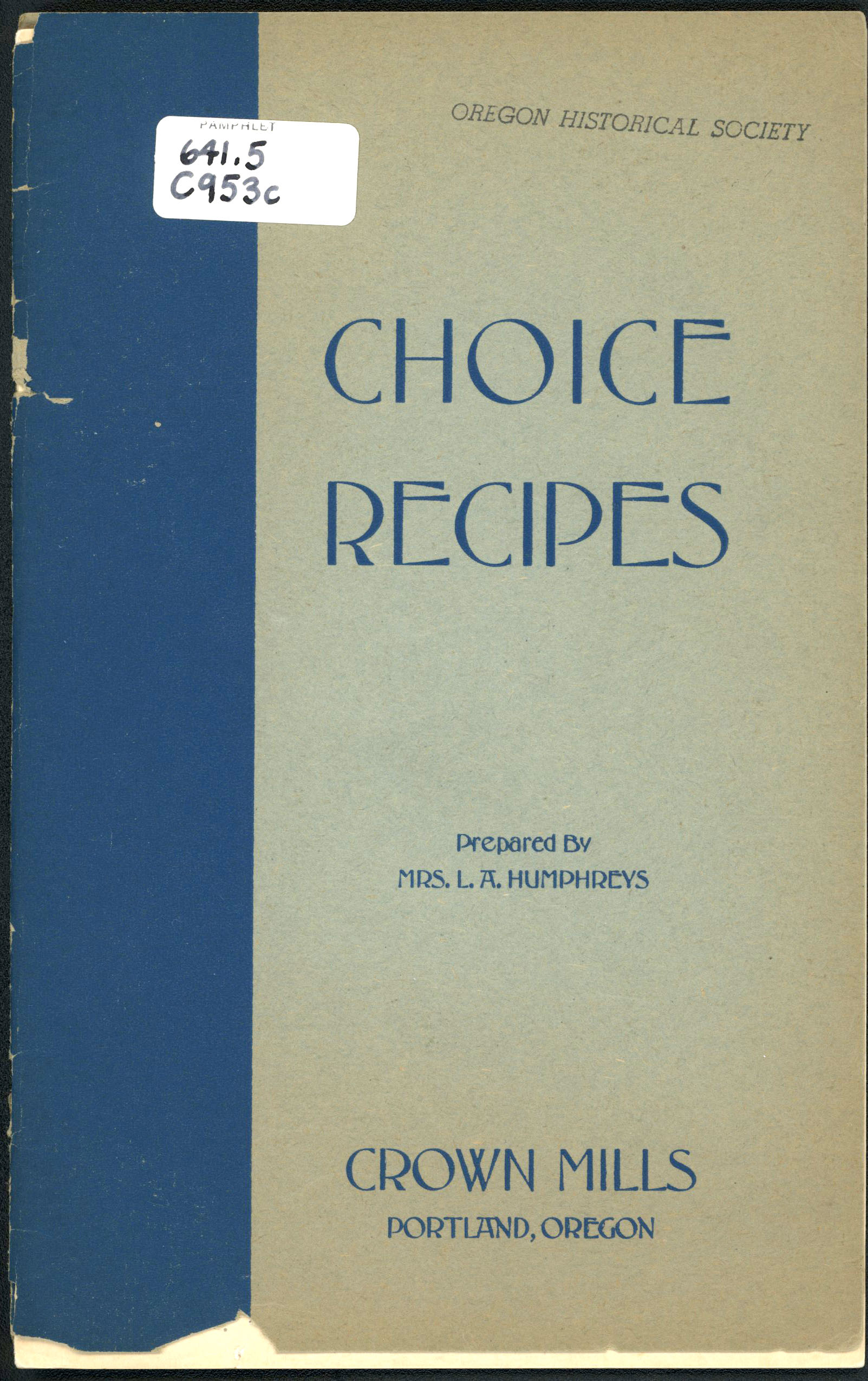 ![]()  Choice Recipes, by Mrs. L.A. Humphries, cover. Courtesy Oregon Hist. Soc. Research Lib., Pam 641.5 C953c