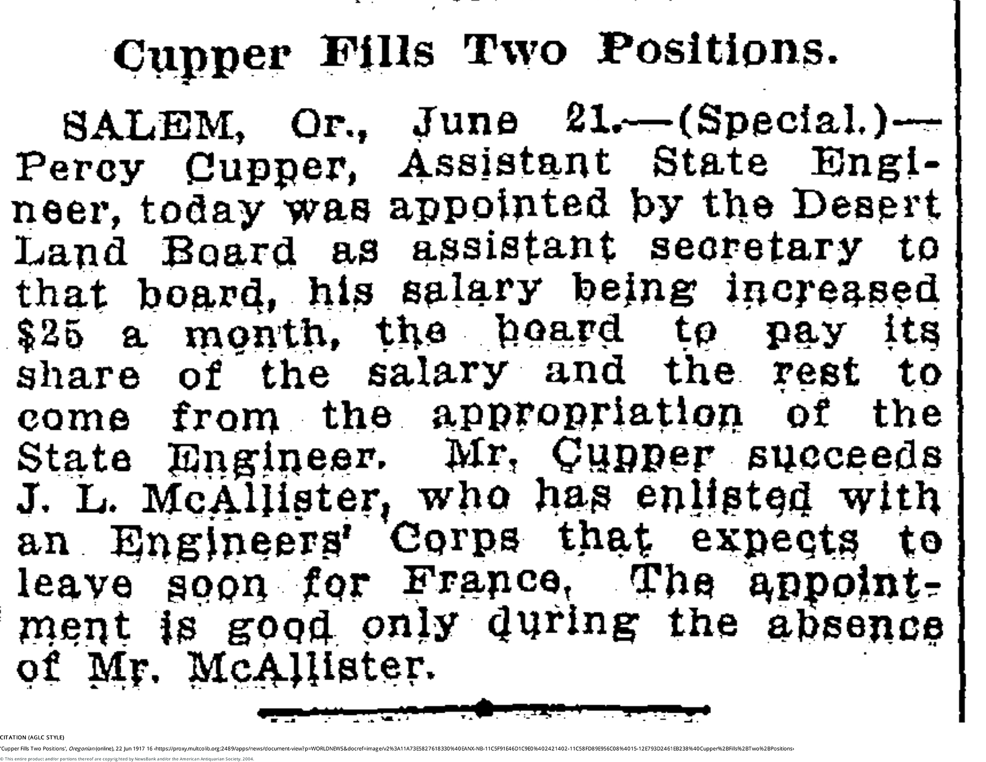 ![]()  "Cupper Fills Two Positions," Oregonian, June 22, 1917. Courtesy Portland Oregonian