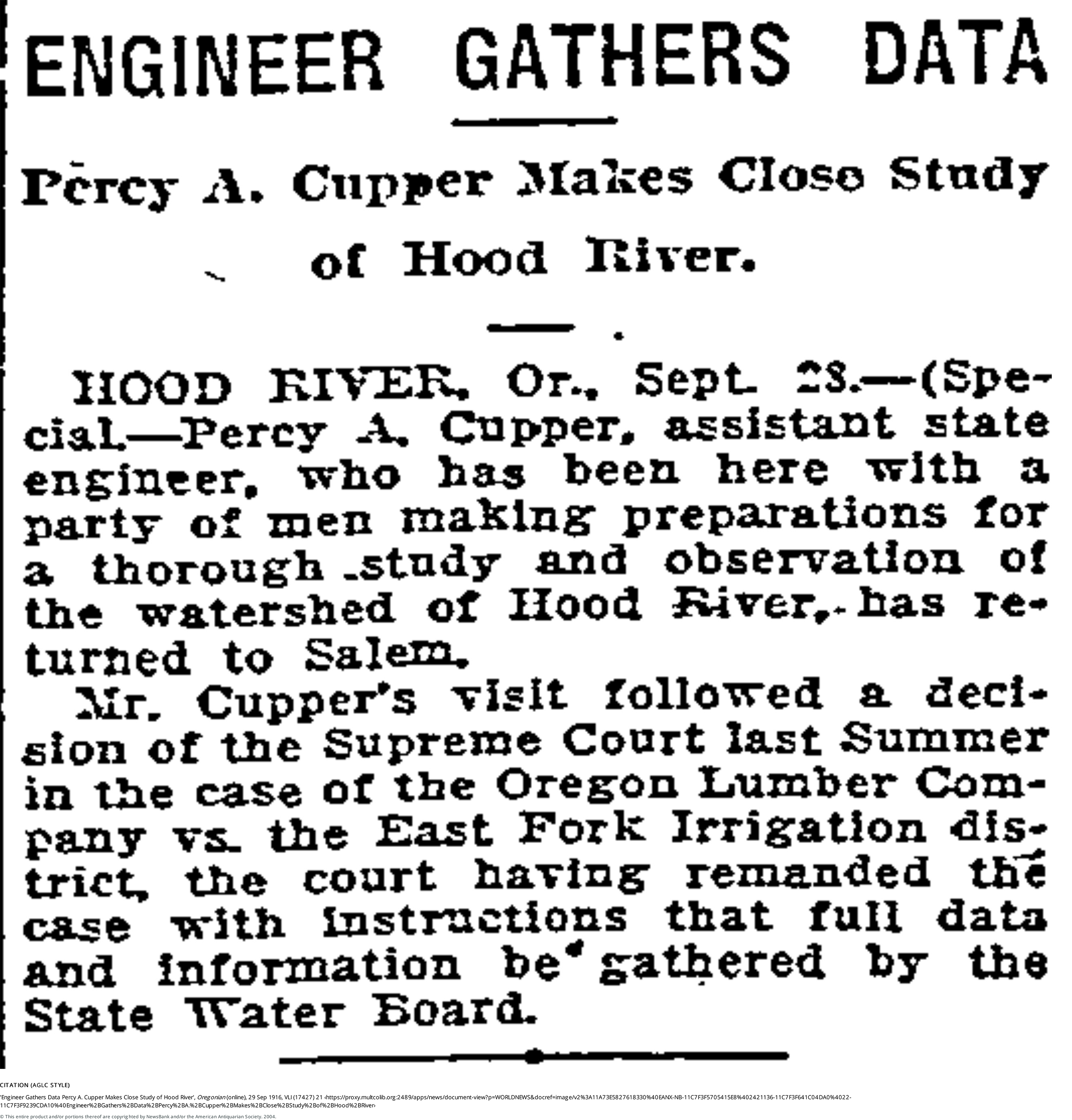 In 1912, Cupper co-authored an important investigative report on a proposed major dam at The Dalles, the first Oregon-sponsored proposal for a multipurpose dam on the Columbia River. In 1918, he argued successfully before the U.S. Supreme Court in Pacific Livestock v. Lewis, prompting the majority opinion that established Oregon’s Water Board authority to adjudicate division of water for irrigation on the state’s streams and rivers. Following on his legal success, Cupper also wrote a seminal document, Irrigation Laws of Oregon (1919), which became a mainstay among reclamationists through the 1950s.