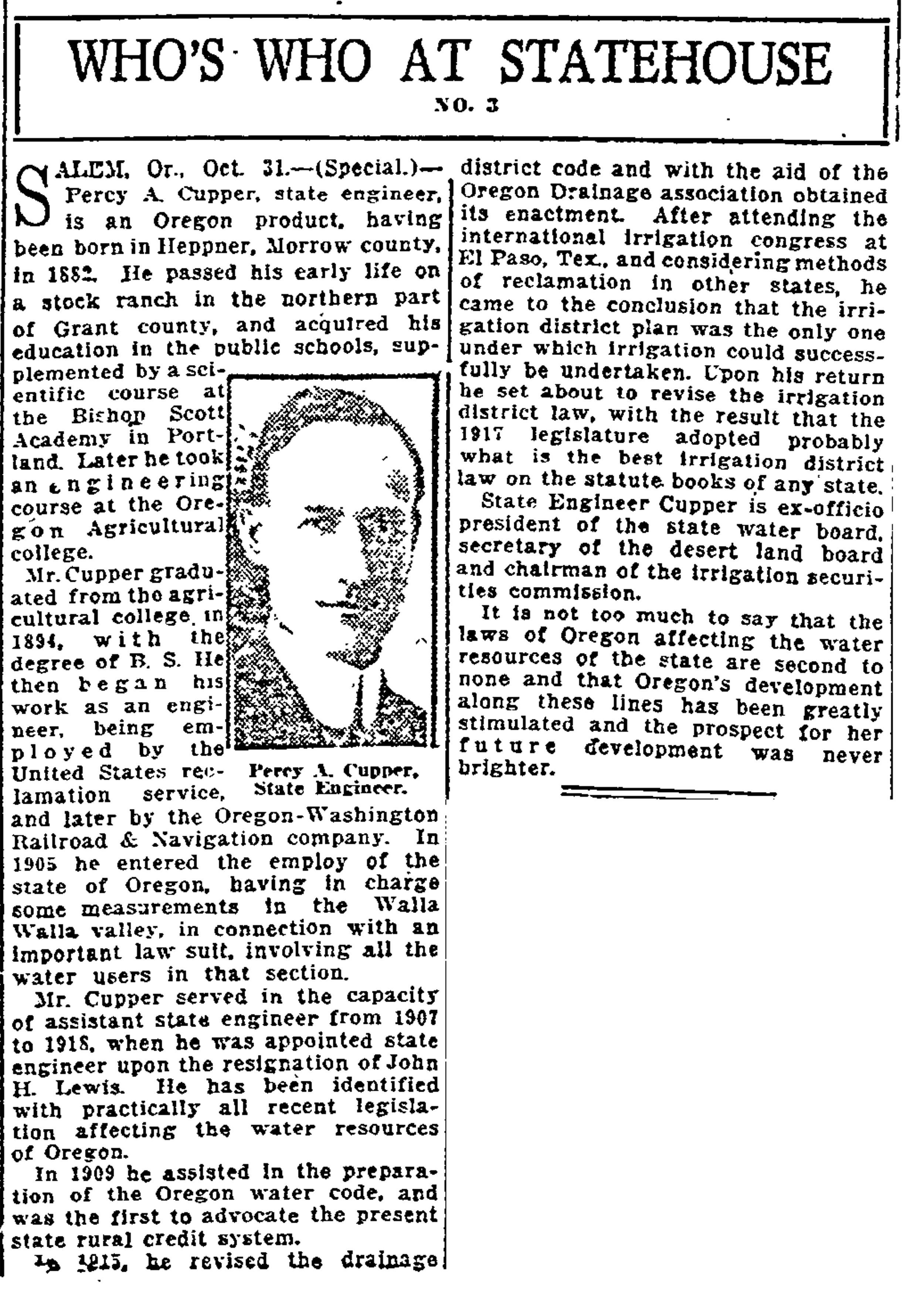 With degrees in engineering and law, Cupper quickly became one of the most successful consultants and water lawyers in the state. His expertise and reputation led him back to work for the State of Oregon as a deputy to the state engineer. By 1918, he was the state engineer, with responsibility for monitoring irrigation projects begun under the federal Carey Act. In that capacity, he served as secretary of the Desert Land Board.