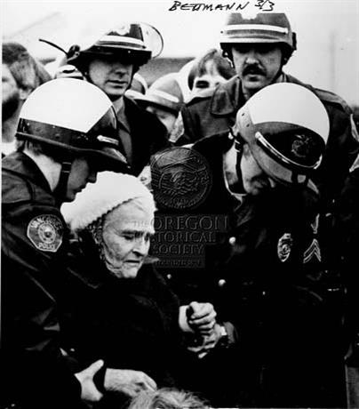 Martina Gangle Curl is carried from train tracks at an anti-nuclear protest to stop a so-called "white train," 1985..