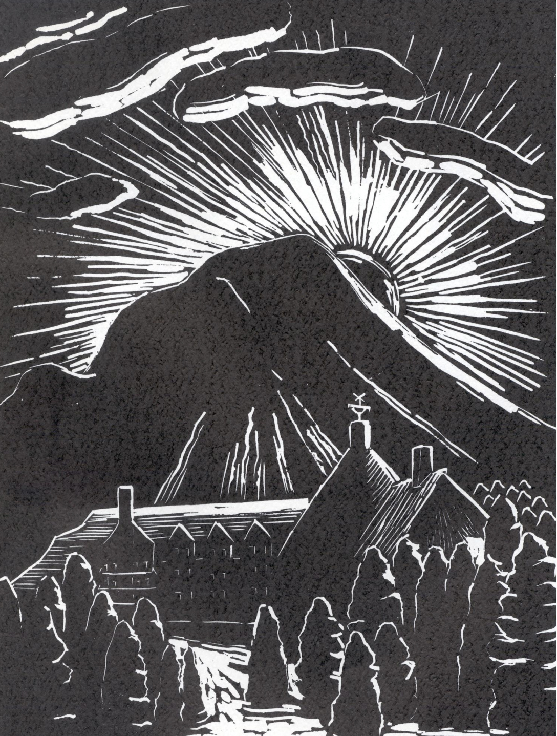 "Sunrise over Timberline Lodge," woodcut, by Martina Gangle Curl, 1937.