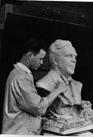 Sculptor Rex Sorenson, then a student at the U of O, works on a bust of Bernard Daly, 1932.