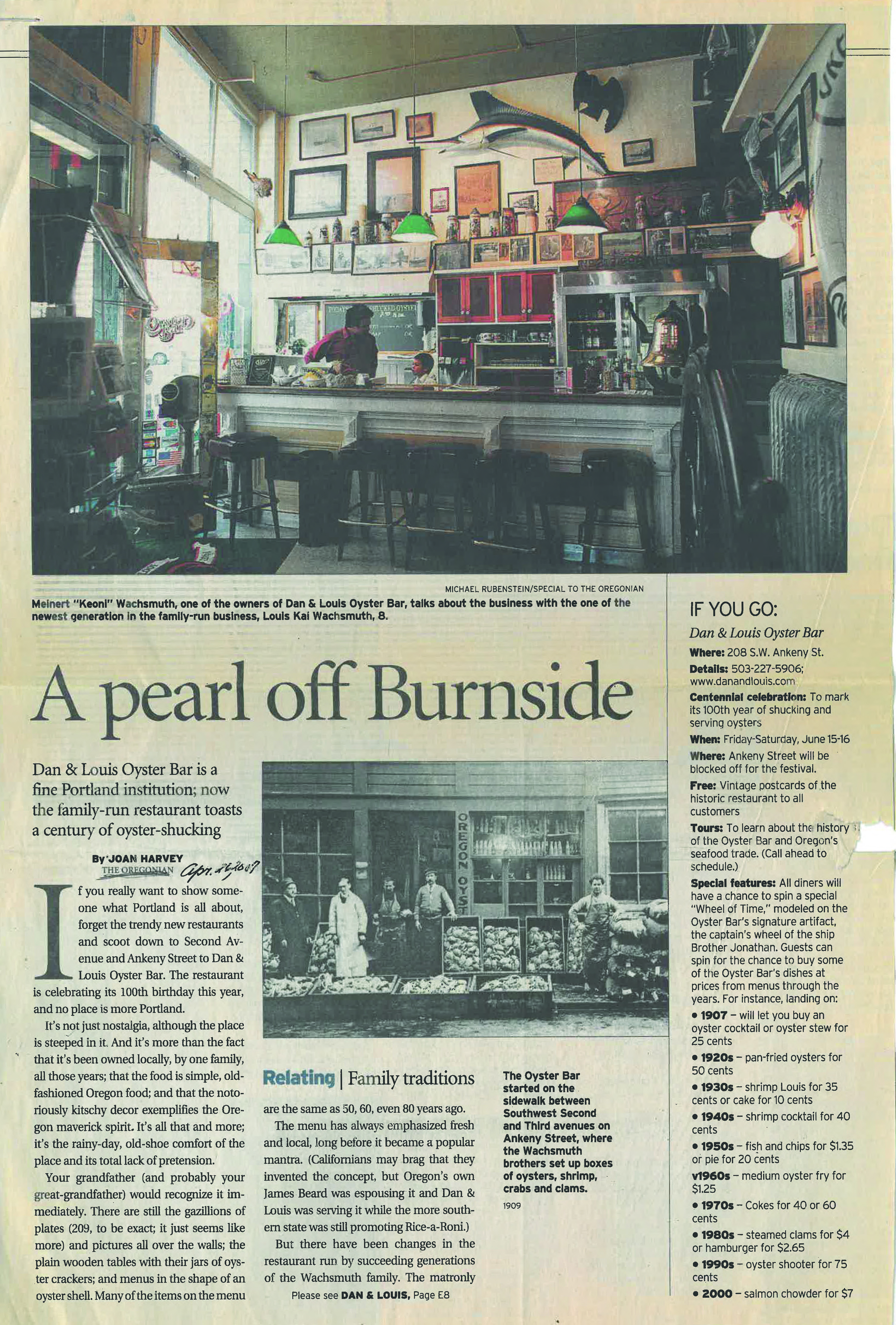 In 1938, Louis Wachsmuth’s oldest son Daniel died of influenza, and the restaurant was renamed Dan and Louis Oyster Bar in his memory. When Louis died in 1958, he was succeeded by his sons, Louis A. and Chester (known as Tuck), who in 1977 passed the business on to their sons, Louis J. and Doug. Over the decades, five generations of the Wachsmuth family worked at the restaurant, including Cory Schreiber, one of Louis’s grandsons who in 1998 was a James Beard Award winner for Best Chef in the Pacific Northwest through his restaurant Wildwood in northwest Portland.
