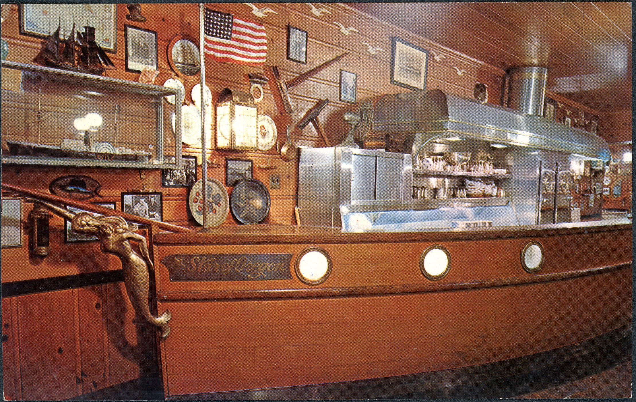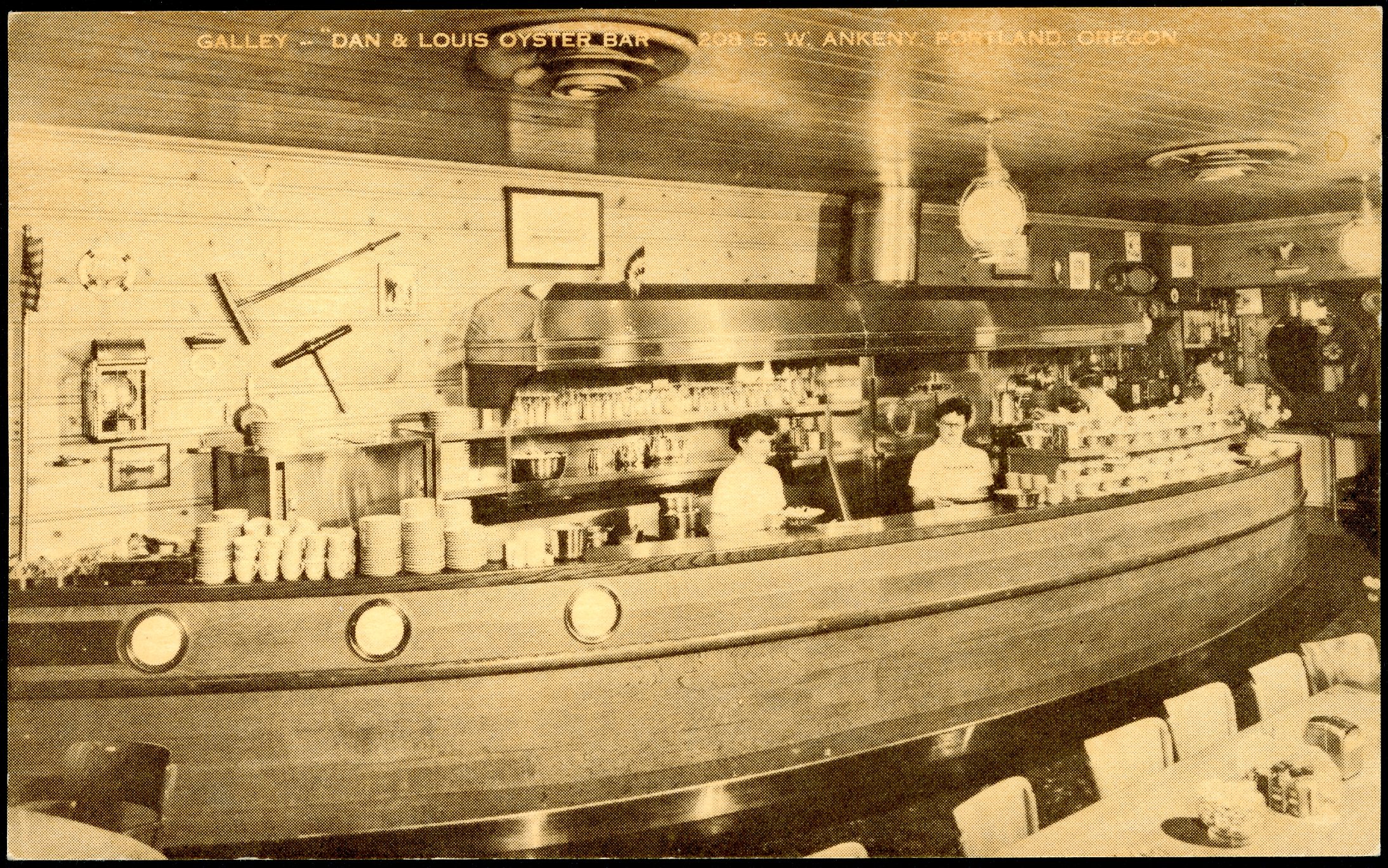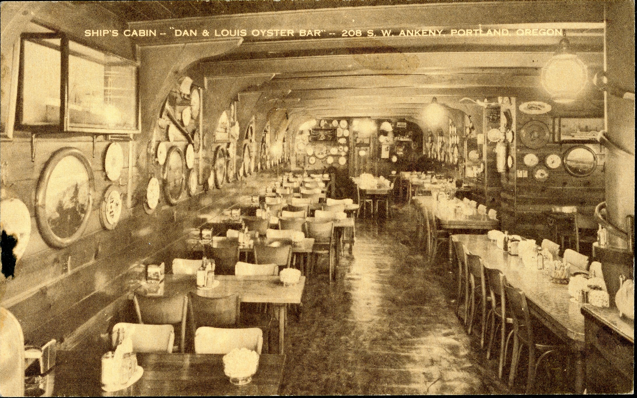 Dan and Louis Oyster Bar is a family-owned seafood restaurant that has operated at the same location in downtown Portland for over a century. Known for its eclectic decor featuring hundreds of collectible plates, mementos, and nautical memorabilia, the restaurant has a clubby atmosphere. Historical artifacts include elements of the Battleship USS Oregon that were preserved prior to its scrapping and the wheel from the steamer Brother Jonathan, which wrecked off the coast of Crescent City, California, in 1865. The restaurant's owners, the Wachsmuths, have long championed the endemic Olympia oyster (ostrea lurida), and their efforts have contributed to the survival of the threatened subspecies.