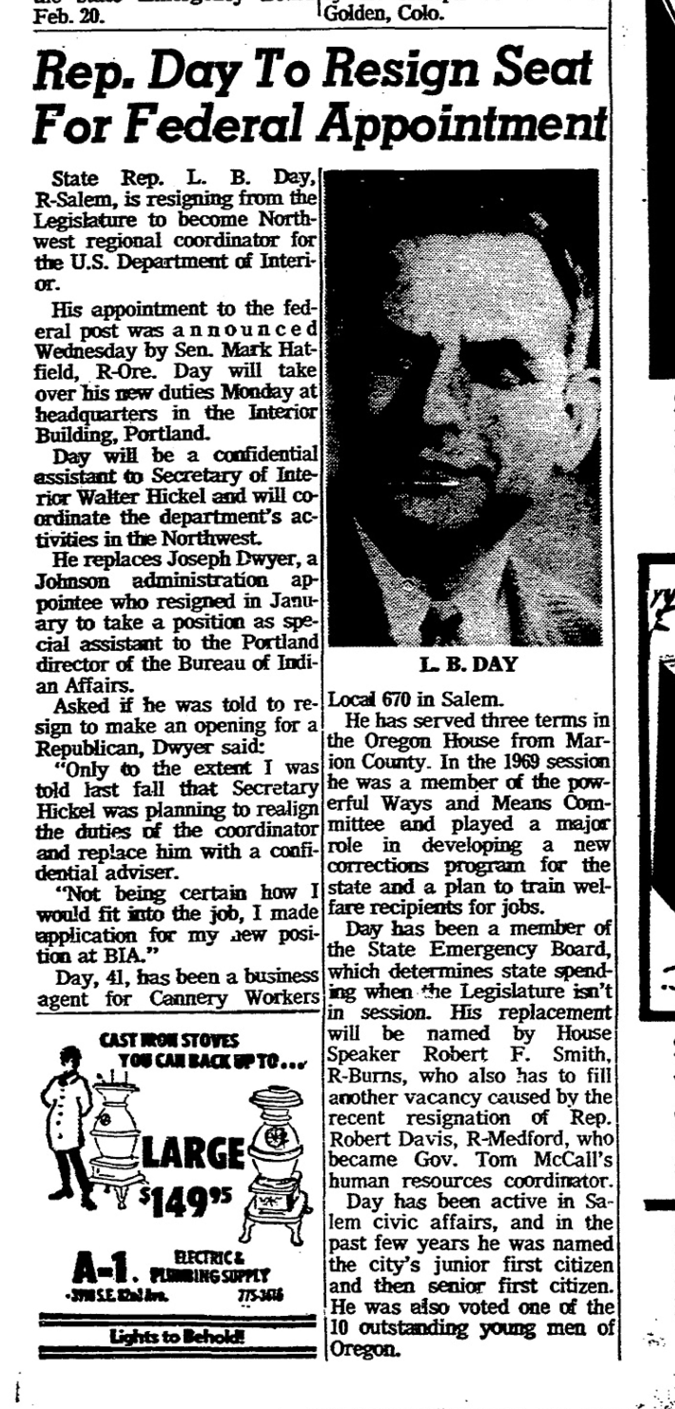 "Rep. Day to Resign Seat for Federal Appointment," Oregonian, Feb. 12, 1970.
