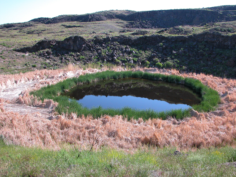 The third most-visited site is Diamond Pond (an informal name), a six-foot-deep, reed-lined, half-acre pool near the western edge of the lava field. The pond lies within an explosion crater that has slowly filled with sediment as its sides sloughed inward. The crater had a narrower throat when first formed, and its floor lay at least 100 feet deeper than it does now. The pond is considered a nonflowing spring, its surface lying essentially at the water table surface. Over the eons, the pond has evaporated and refilled repeatedly as the water table has fluctuated through droughts and wetter times. Diamond Pond is also known as Malheur Maar (an informal name), from a German word for lakes found in explosion craters.