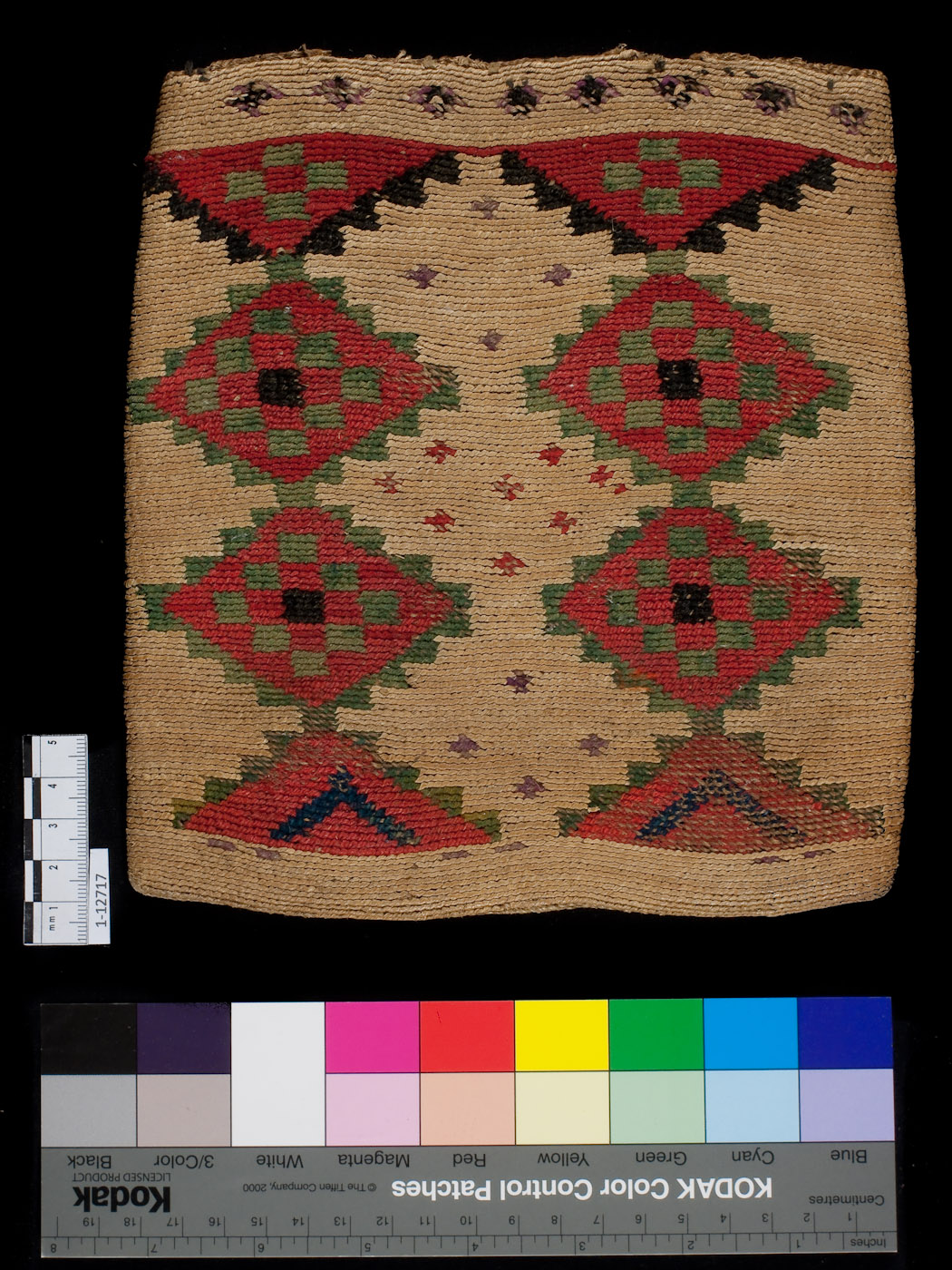 Flat twined bag, Columbia Plateau, dogbane, jute, corn husk, wool, 19th century.