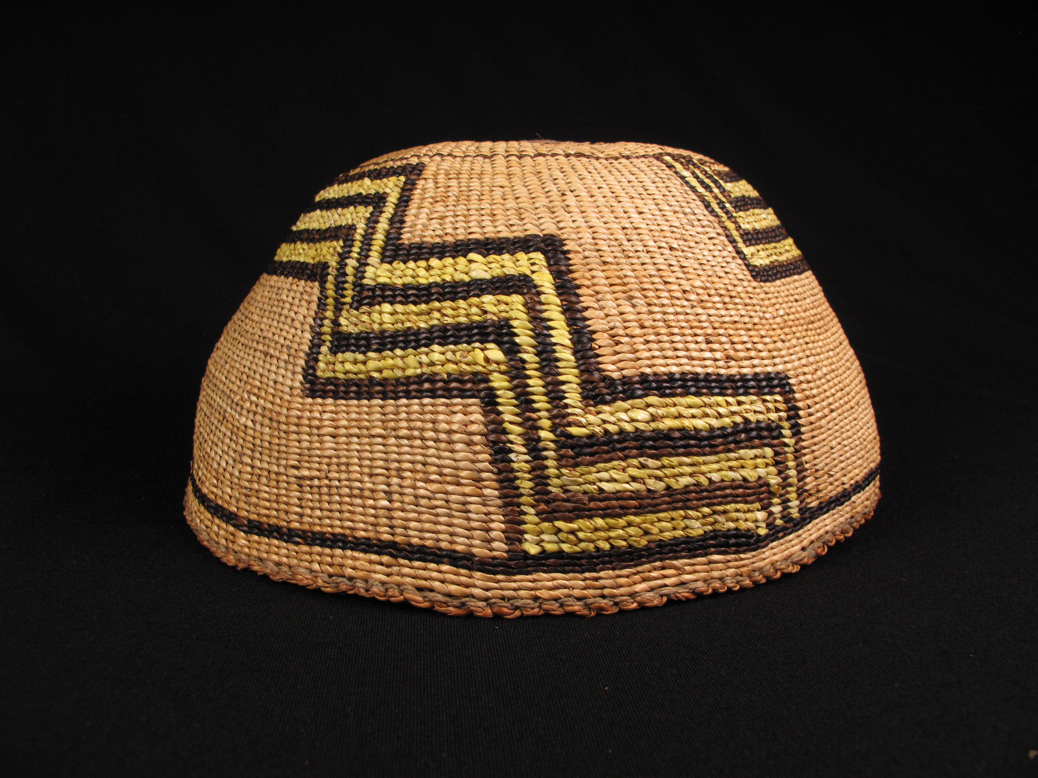 Women's twined hat, Klamath, dogbane start, tule, porcupine quils dyed yellow, 19th century.