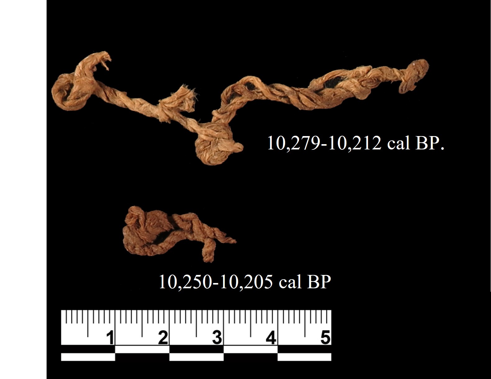 Dogbane possible looped net (top), Paisley Caves, 10,279-10,212 years old, and dogbane cordage (bottom), Paisley Caves, 10,250-10,205 years old.