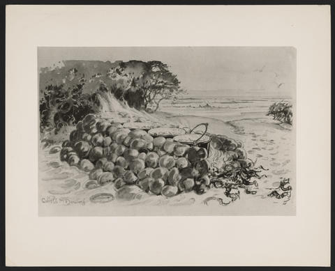 Photograph of an image of "Kettles Cooking on the Beach" by Colista Dowling, c. 1917.