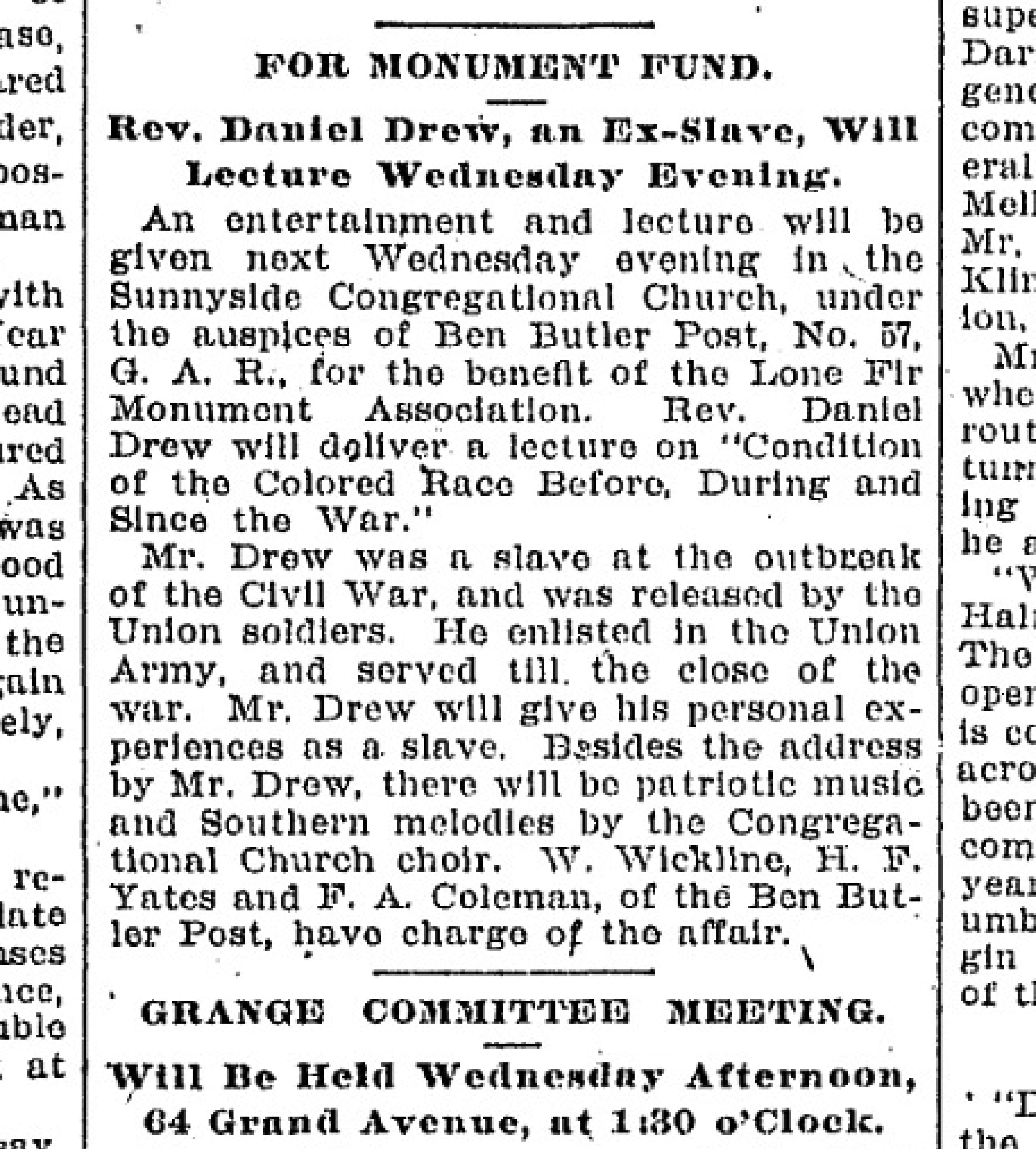 "Rev. Daniel Drew, an Ex-Slave, Will Lecture Wednesday Evening," Morning Oregonian, Nov. 17, 1902.