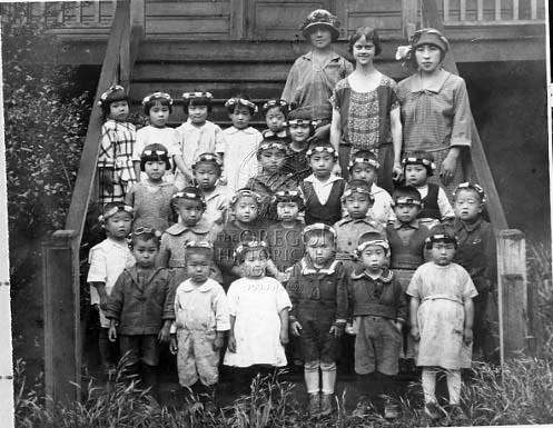 During its early evangelism, the mission grew rapidly, attracting more than 100 Issei by 1894 and renting its fourth building by 1895. After it made its first building purchase in 1897, the mission expanded its programs to include a Sunday School and a ladies’ society. In 1902, plans were made to form a church, and the next year a house on Northwest 15th and Glisan was purchased. While members and friends raised $2,500, the Methodist Episcopal National Board of Missions granted $3,500 toward the purchase. The congregation grew from mostly men to include “cute children and graceful ladies.” An English-speaking kindergarten gave Nisei (second generation) children the chance to improve their language skills.