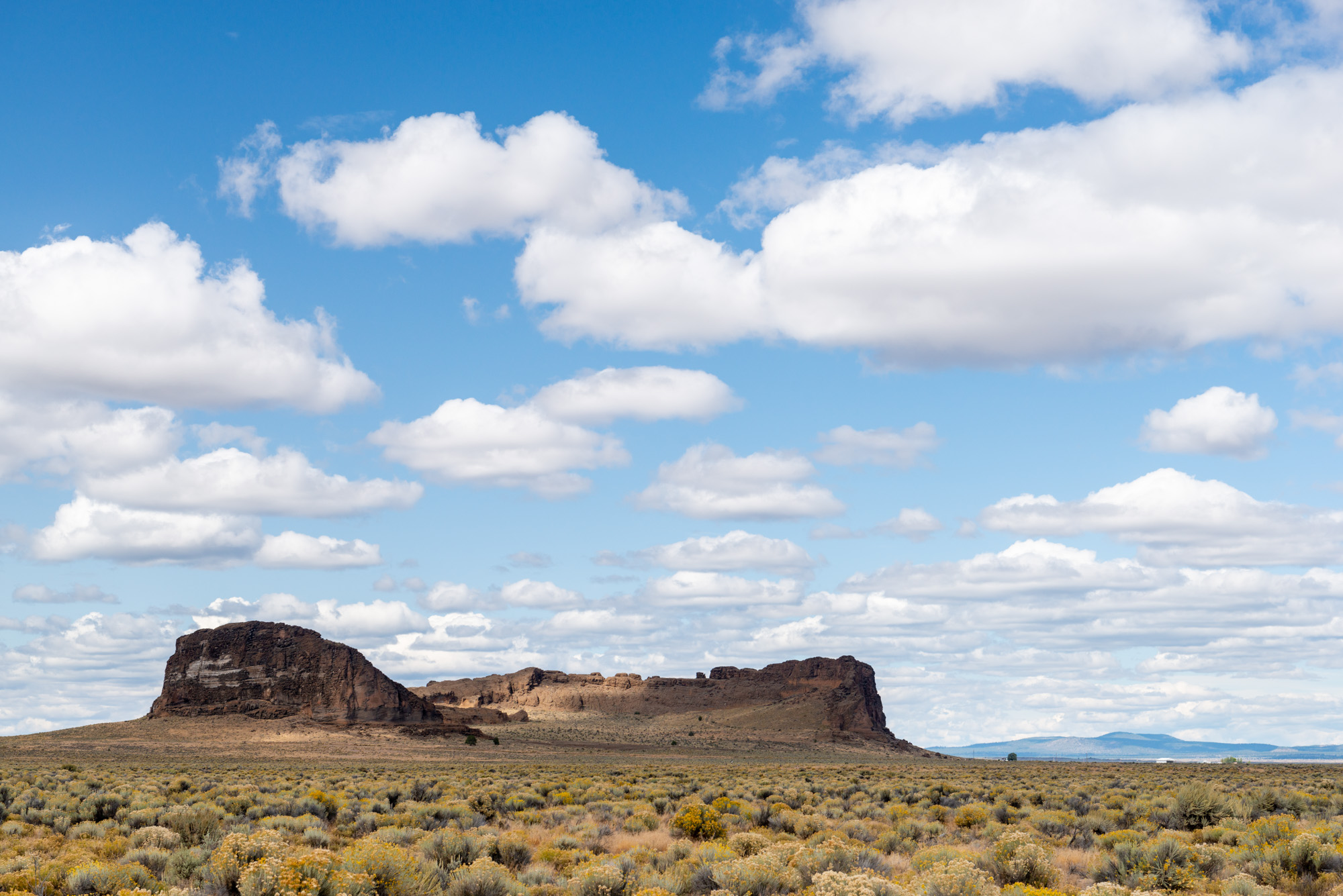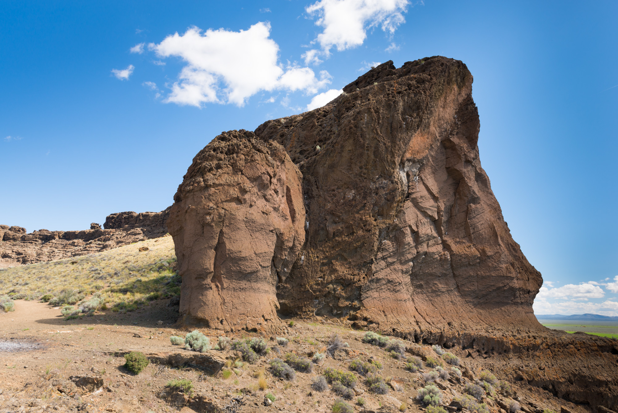 Fort Rock’s cliffs are pitted by cavernous weathering, which is the weakening of the rock matrix by mineral salt deposits. Today, the pitting provides roosts and nesting sites for rock pigeons, ravens, and prairie falcons. Indeed, public access is closed to nesting areas during falcon brooding season from February 15 to August 30. White-throated swifts nest in the larger cracks in the cliff faces, and cliff swallows build their mud-daub nests beneath overhangs.