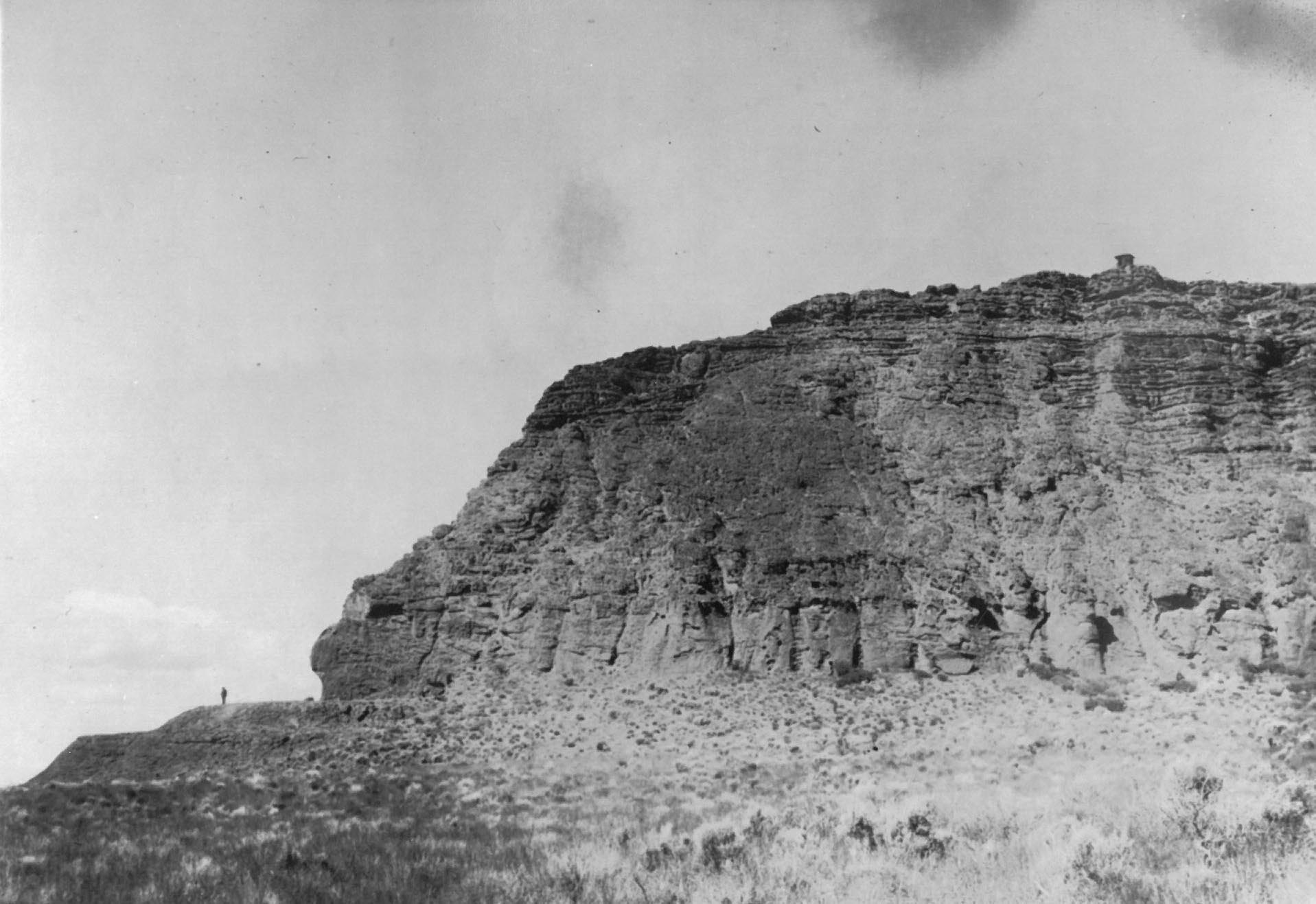 By the time EuroAmerican settlers moved into the Fort Rock area in the nineteenth century, the area was primarily Northern Paiute land. The U.S. government used treaties and armed conflict to relocate the Paiute to reservations, while also luring farmers to the region with nearly free land. The high desert, however, is semi-arid, and despite benefitting from a temporary wet period from 1905 to 1920, homesteaders suffered through drought and deadly frosts. Most left the area to be replaced by cattlemen, who reportedly used Fort Rock’s natural amphitheater as a round-up corral. An early photograph shows a fire lookout structure on the south bluff of Fort Rock in the mid-1920s, its position marked until recently by a benchmark of similar vintage.