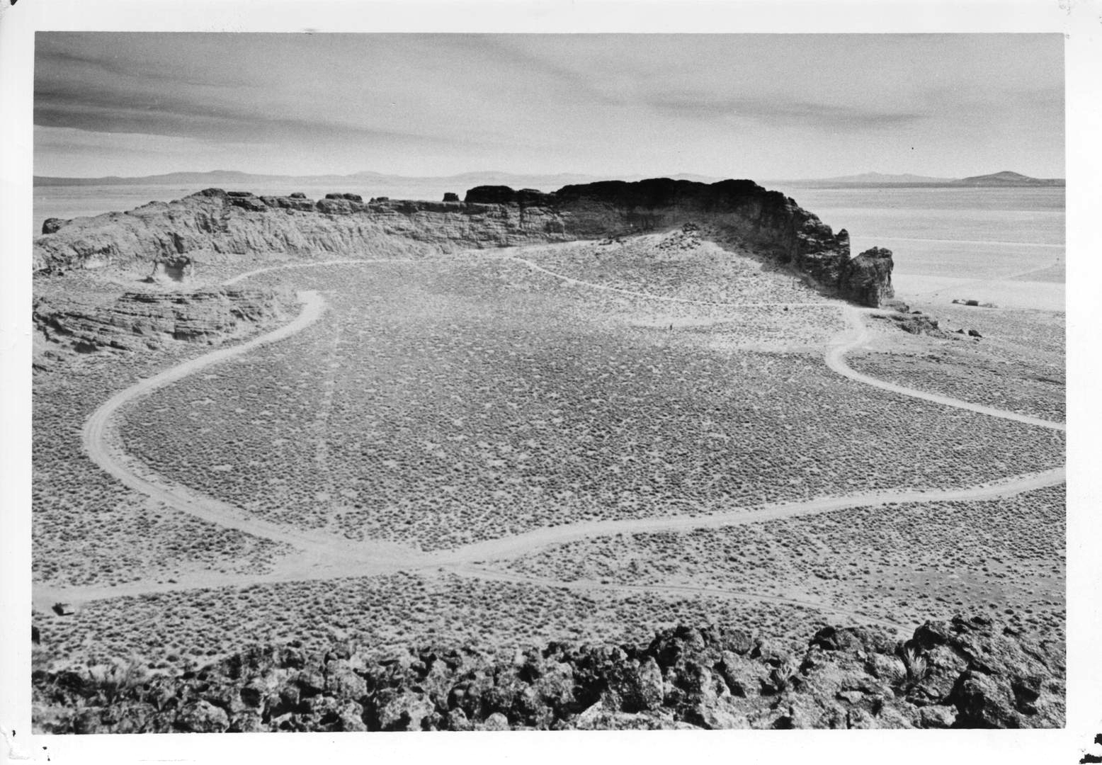 Fort Rock is a volcanic citadel at the western end of the Fort Rock Valley of central Oregon, its cliffs rising nearly 260 feet (ft.). Geologically, the formation is a tuff ring, “tuff” being the term for well-cemented ash deposits. When viewed from above, the boldly outcropping part of Fort Rock forms an oblong ring with an opening to the southeast, much like a distorted horseshoe. Measured rim to rim, the ring is about 2,300 ft. (northeast-southwest) by 1,700 ft. (northwest-southeast) (fig. 1). The formation encircles a vent from a brief eruption long ago. As named, “Fort” owes to the landform’s shape and has nothing to do with a military site or fur-trade post.