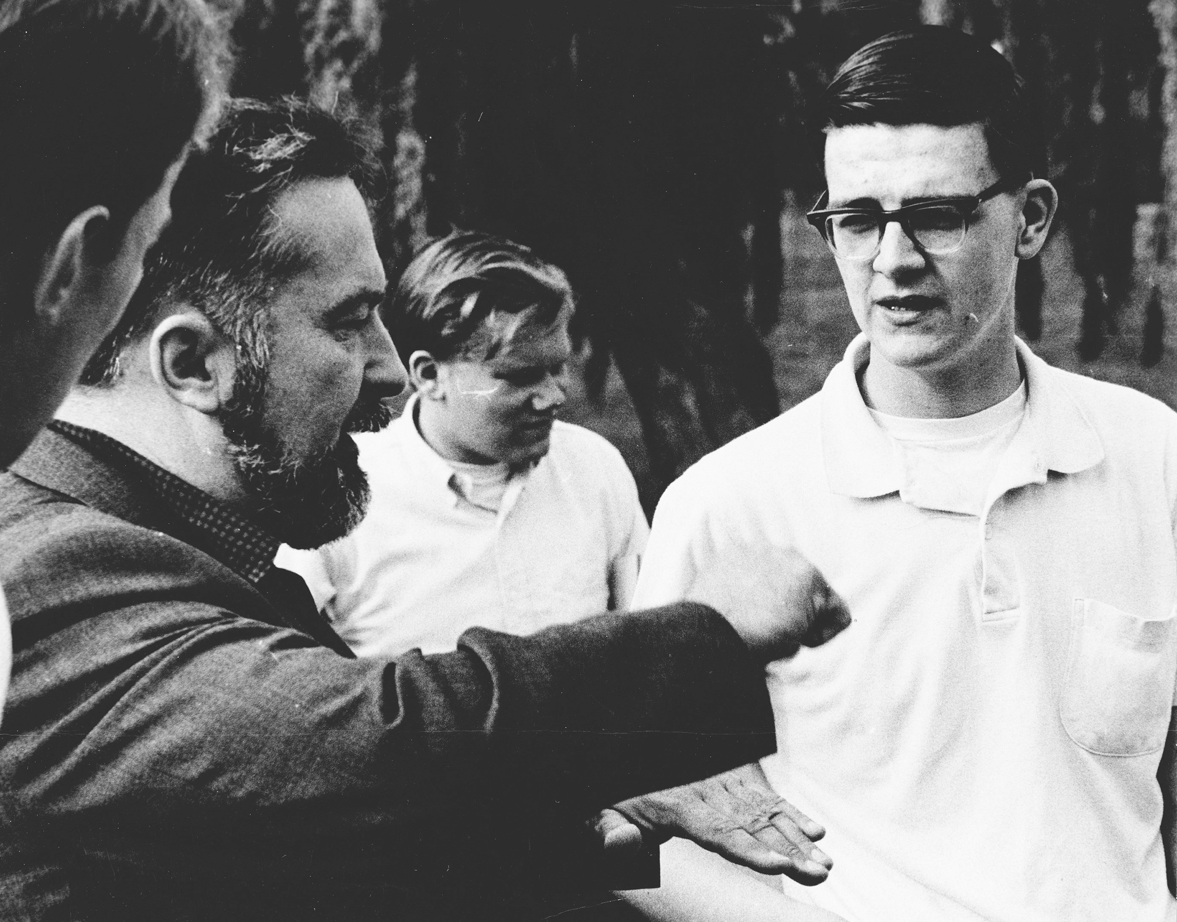 David Foster and Jack Wilkinson, both art professors are in discussion near a large mural that Jack was retouching in 1973.