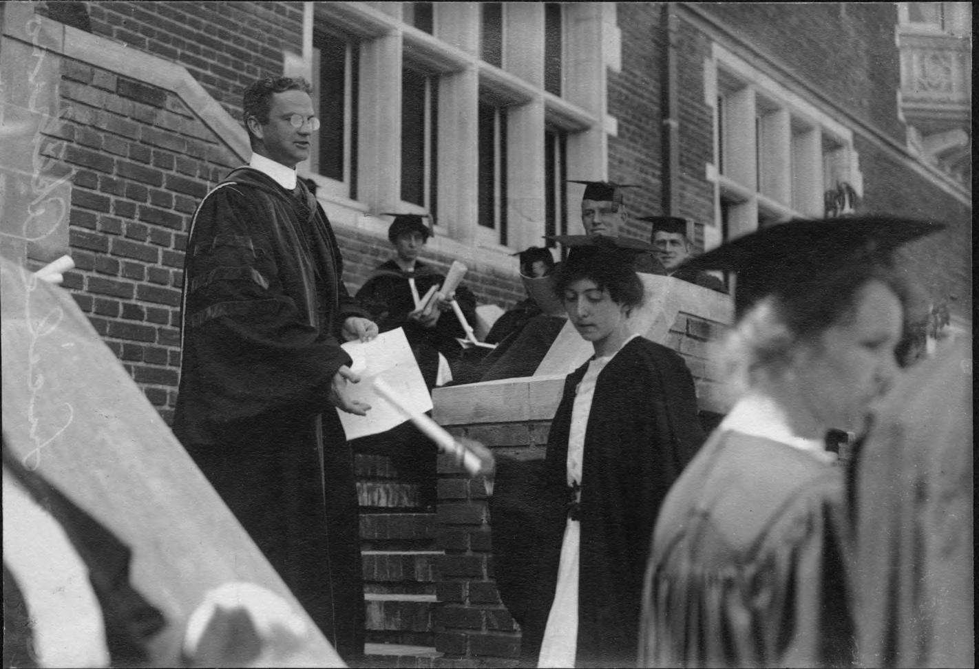 William T. Foster handing out diplomas to Reed graduates in 1915..
