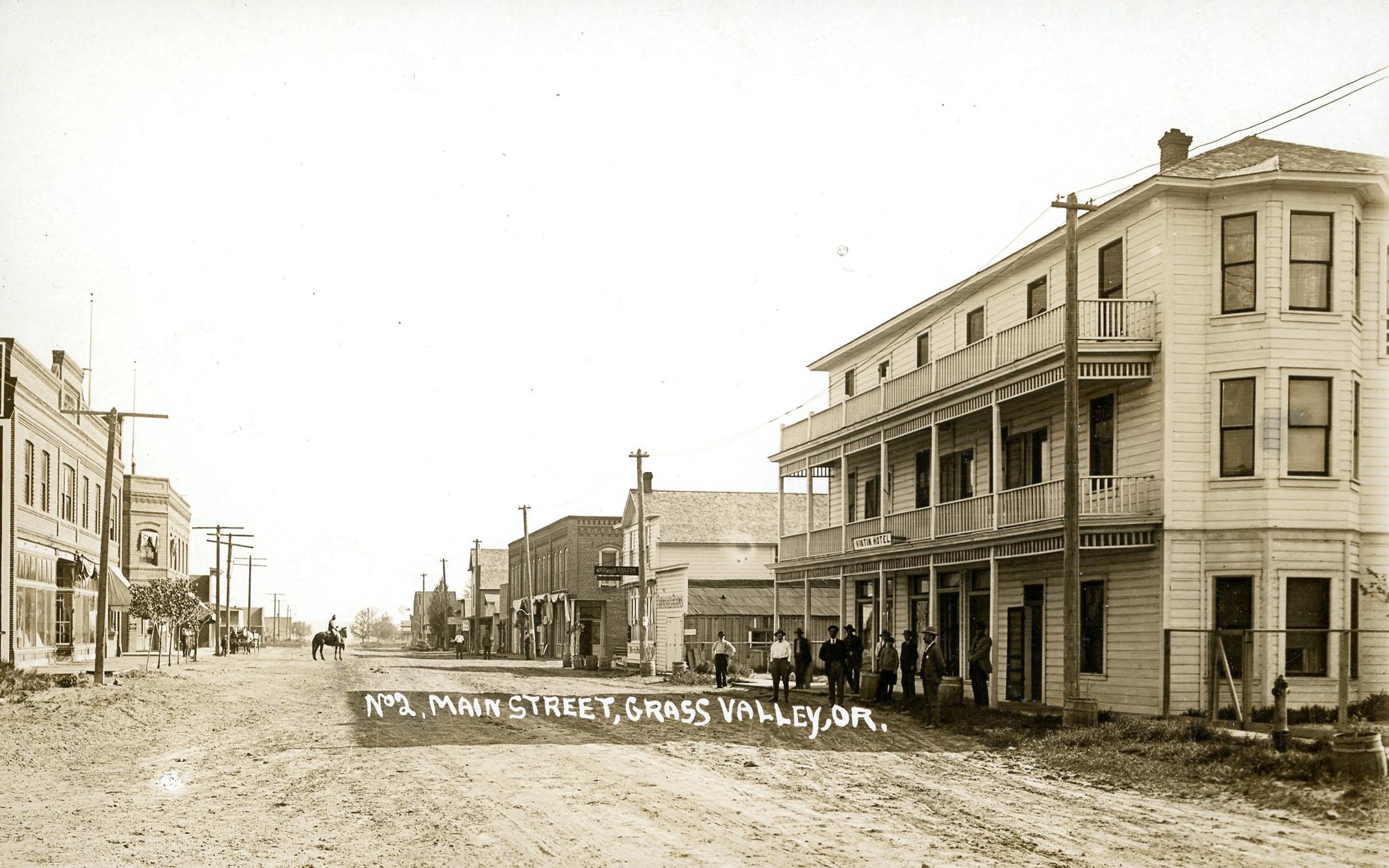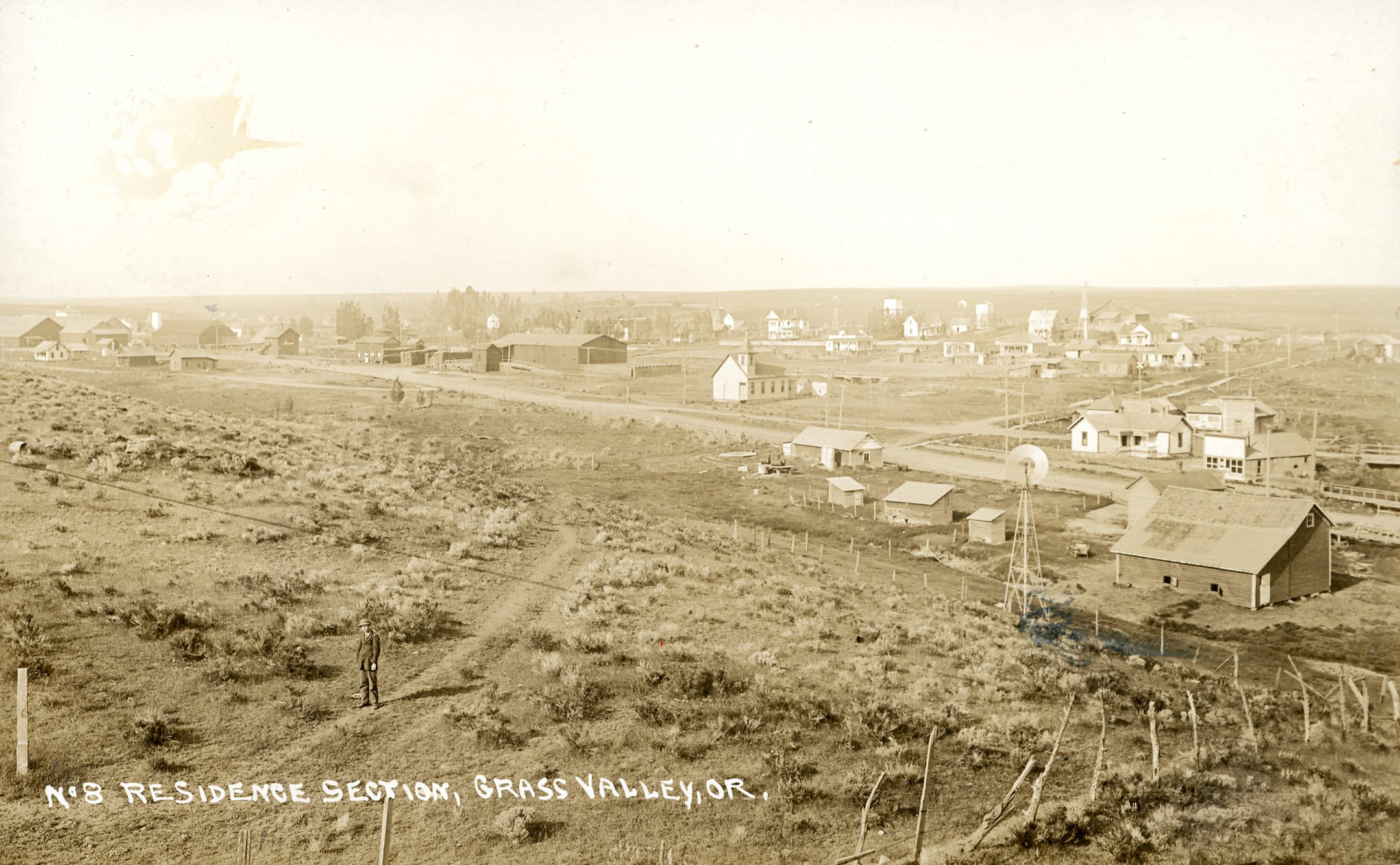 The first EuroAmericans passed through the region in 1846, following the southern route of the Barlow Road cutoff on the Oregon Trail, just to the north of present-day Grass Valley. In 1878, Dr. Charles R. Rollins, one of the first white settlers in the area, built a hotel and clinic to serve ranchers and wheat farmers in the town. The post office was established in 1882, and the town was platted in 1891. The Eastern Oregon Land Company and Charles W. Moore owned most of the lots, and Moore was responsible for founding and developing the town’s newspaper, the Grass Valley Journal, and a telephone line to Rufus as part of the Sherman County Telegraph and Telephone Company. The town was incorporated on September 14, 1900.