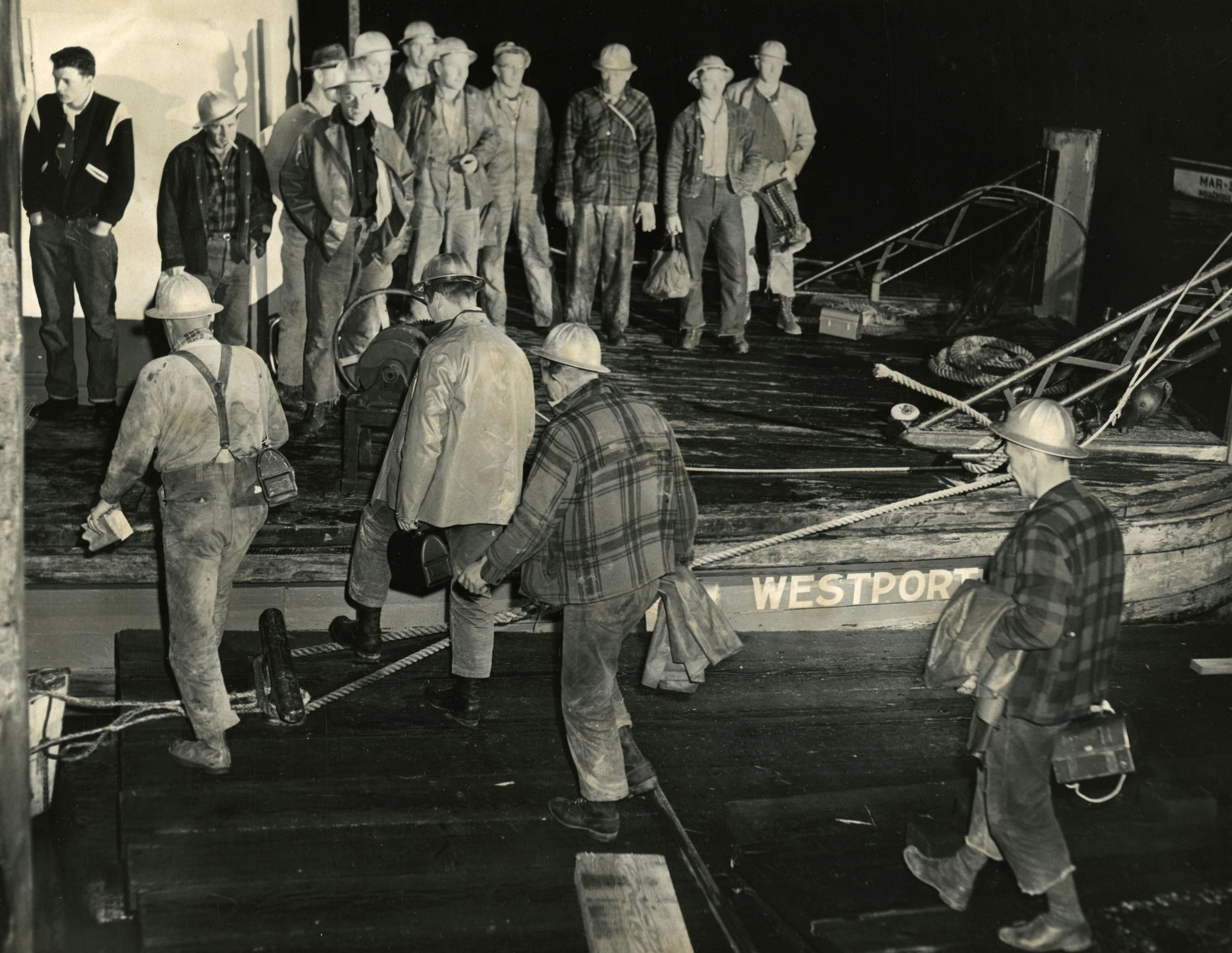 Reedport loggers using ferry to get around landslide blocking the highway to the cut site, 1956.