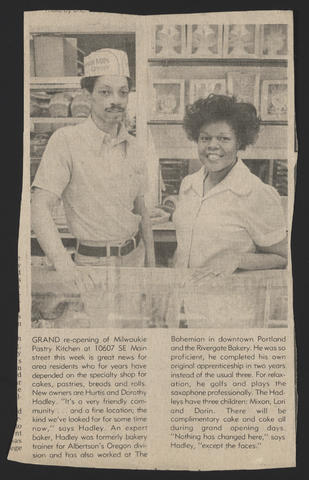 For weeks before the grand reopening of the Pastry Kitchen in April 1977, the Hadleys ran ads in local newspapers, and Carl Dixon, the previous owner, spread the news in the community. Of the 17,931 people in Milwaukie in 1980, only 72 were African American, so the Hadleys knew that most of their potential customers would be white. "Not everyone was pleased to have an accomplished black couple in their midst at the time,” Hurtis Hadley told the Portland Observer in June 2014, “or black people at all in the mostly white town," But once the bakery opened, Milwaukie welcomed them. On “day one we’re in the shop and got all these flowers,” Hurtis remembered in his oral history. “Different businesses throughout the community had sent them to…welcome us to the community, and lo and behold, we had instant business.”
