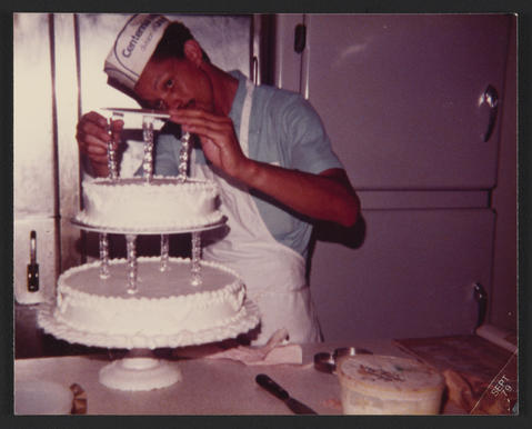 Hurtis Hadley constructing a tiered cake, 1979.