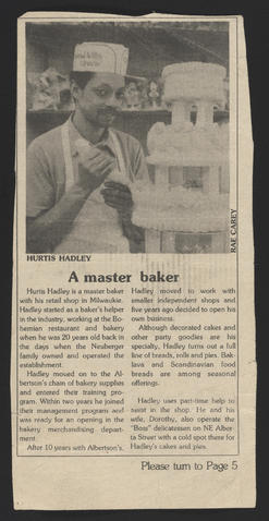 Clipping from an unknown news publication about Hurtis Hadley and his bakery, c.1982.