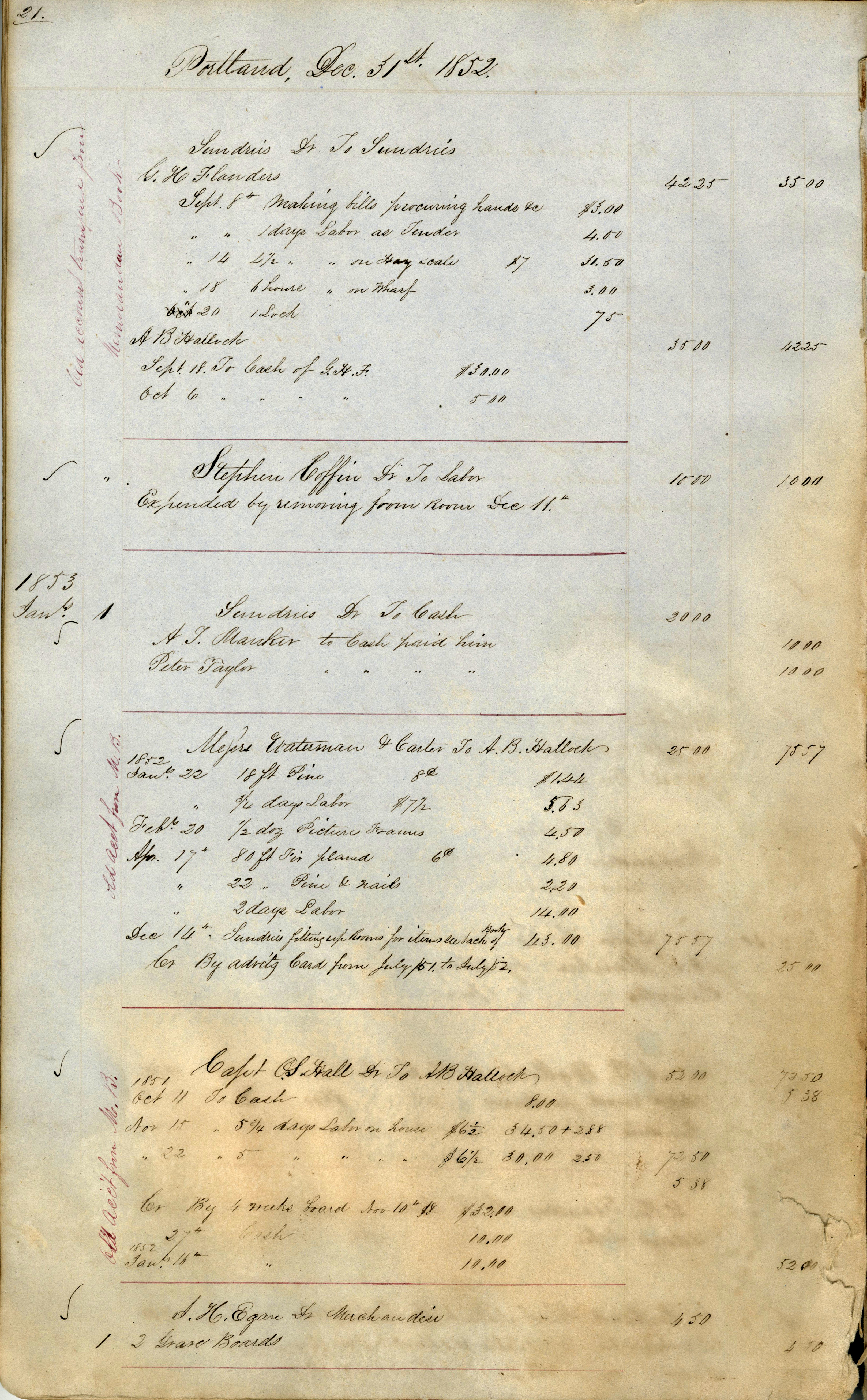 Page from A.B. Hallock's account book, 1852.