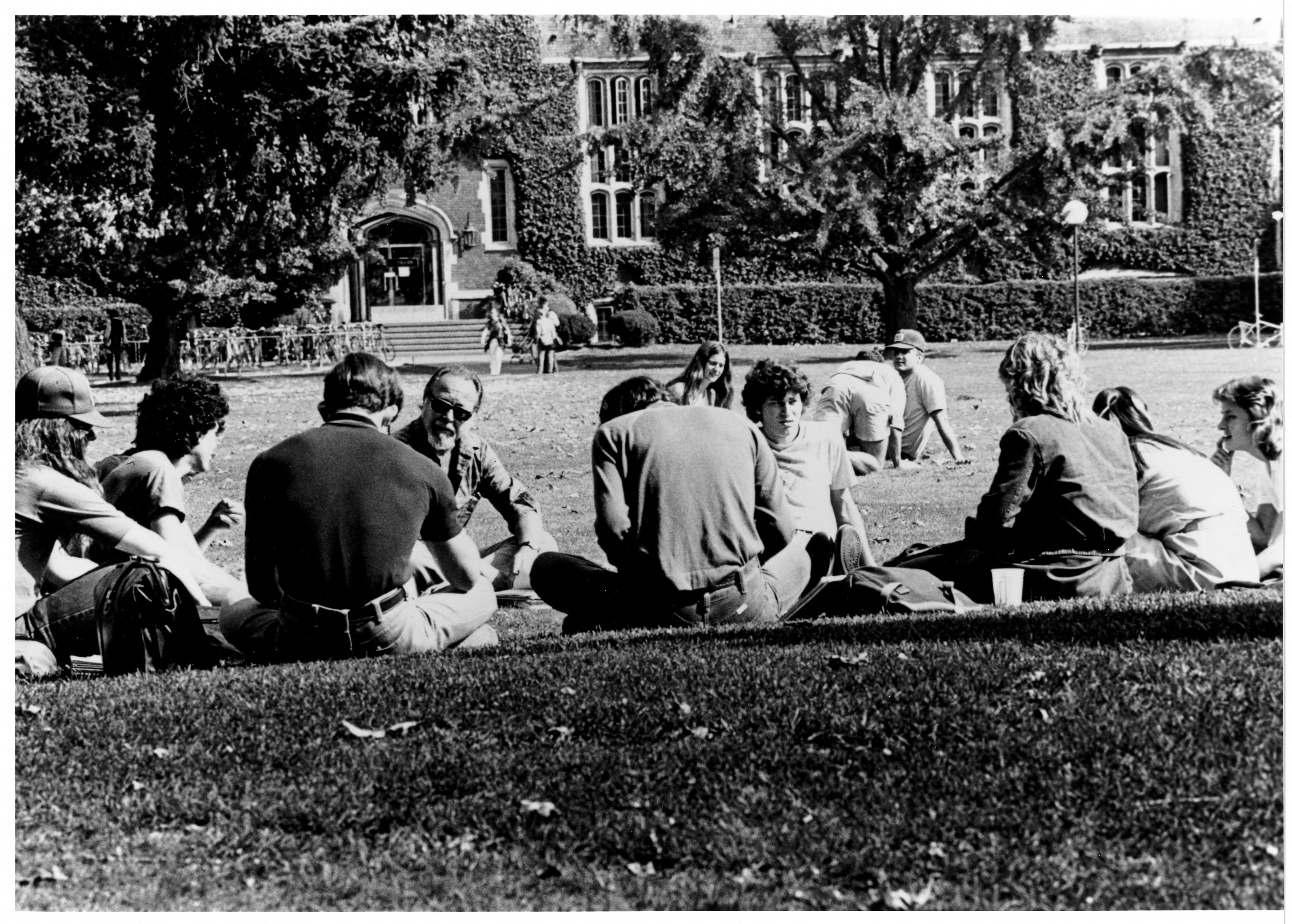 Kenneth O. Hanson (facing the camera and wearing sunglasses) leads an outdoor class session at Reed College, 1974.