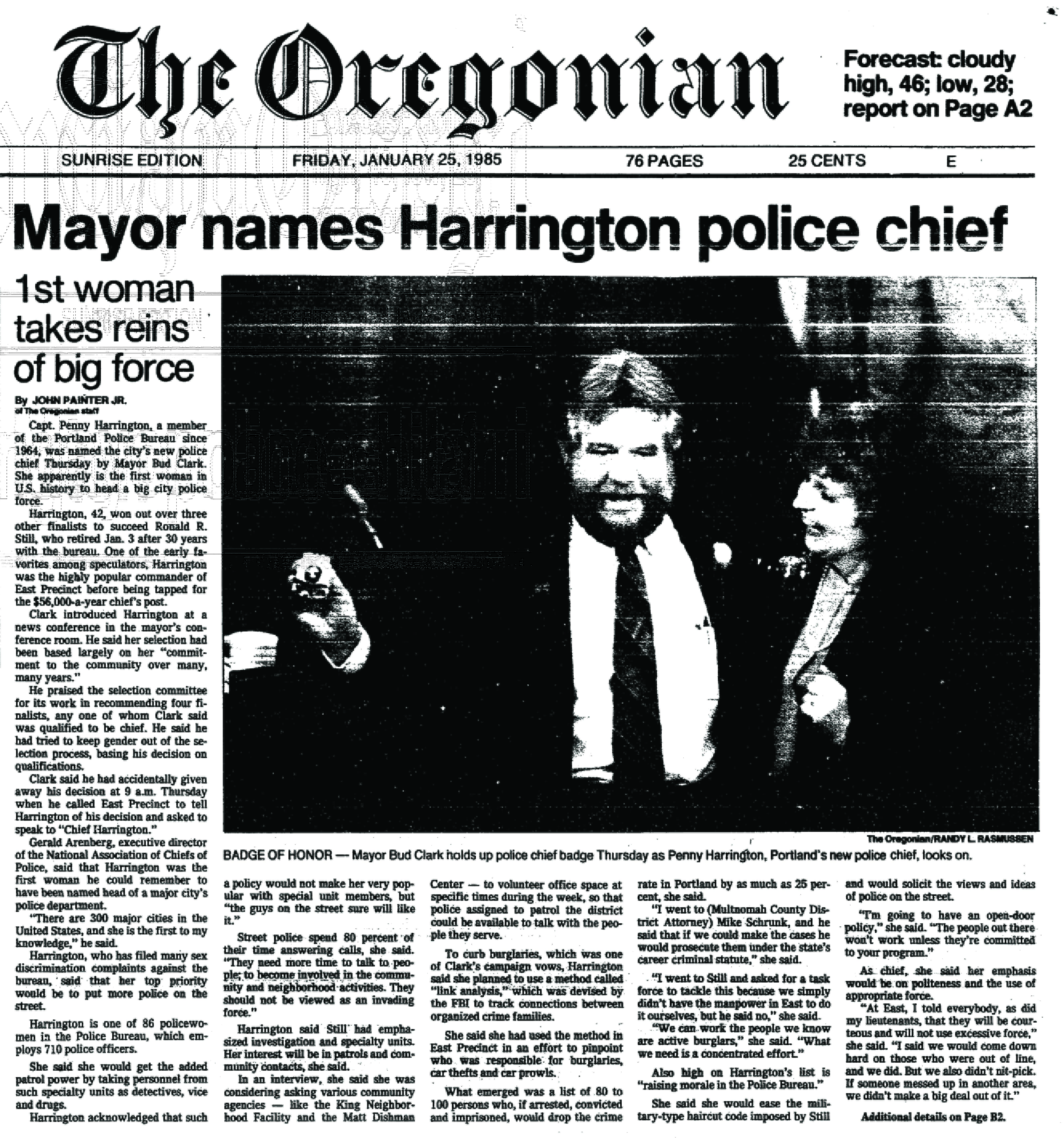 "Mayor names Harrington police chief," Oregonian, January 25, 1985.