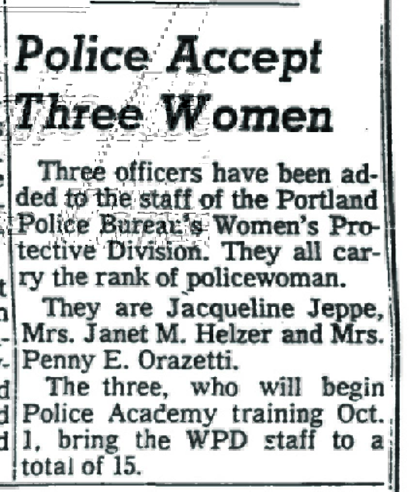 After graduating in 1964, Penny and her husband Richard Orazetti moved to Portland, where she joined the Portland Police Bureau’s Women’s Protective Division. Like all other police women since the Division’s inception in 1908, she was limited to investigating matters relating to women and children (the first fulltime paid policewoman in the United States, Lola Greene Baldwin, led the Portland WPD from 1908 to 1922). By 1968, Harrington (then Orazetti) had begun to question her narrow role and applied for a position in another division. When she was told she did not qualify because she was a woman, she took her case to Mayor Terry Schrunk, who overruled the bureau’s decision. In 1970, she became the first policewoman with an assignment outside the Women’s Protective Division. Penny's sister, Roberta Ledyard, joined the force in 1971. By 1970, the Orazettis had divorced (they had one son); Penny married Gary Harrington in the early 1980s.