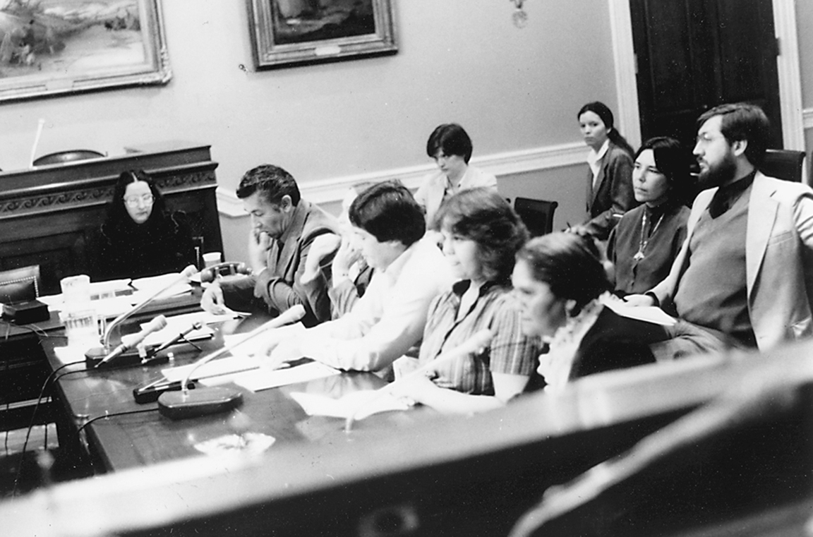 Kathryn Harrison, far left, at Grand Ronde restoration hearing, 1983.