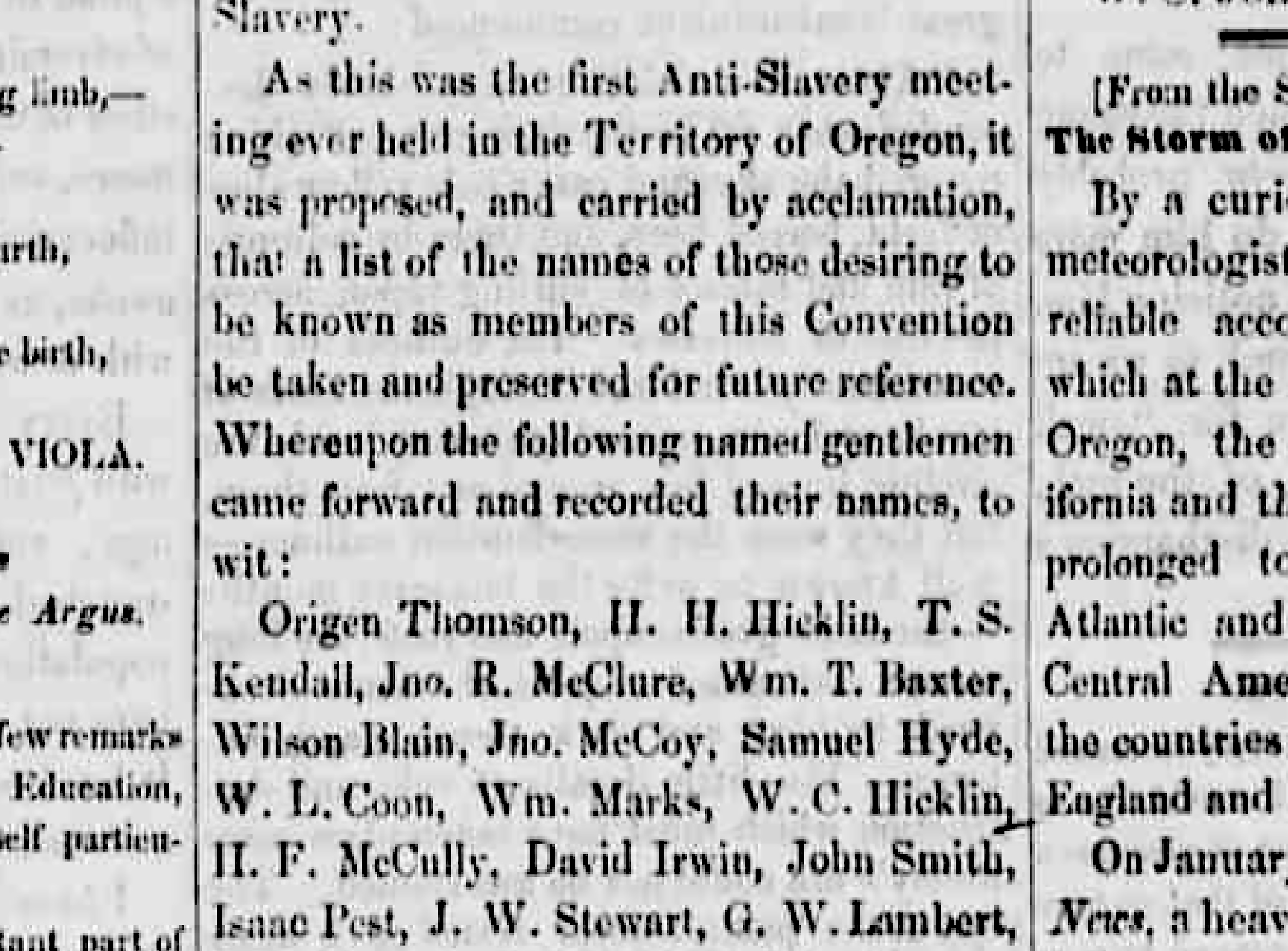Those goals surely inspired Hicklin and his two younger brothers to join the Oregon Free Soil Convention that convened in Albany in June 1855. Recognized as the first antislavery political gathering in Oregon Territory, the convention passed resolutions condemning all federal legislation on slavery since 1850, including the 1850 Fugitive Slave Act, as "unjust and anti-republican, oppressive and cruel.” Attendees insisted on “the overthrow of an institution so utterly opposed in every principle of political, as well as of moral and religious right.” In a final resolve, they celebrated the women present for their shared commitment to “human liberty." A few weeks later, Black abolitionist Abner H. Francis, who lived in Portland, wrote his friend Frederick Douglass that while “it will be a hard contest” the “friends of freedom” were mobilizing in Oregon.