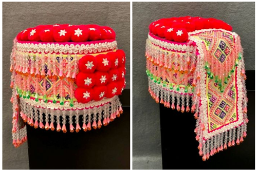 Hmong hat made by May and Aimee Xiong (not related). Hat is made of cross stitch and beads instead of traditional coins, 2001.