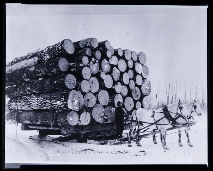 Stewart Holbrook. Team of workhorses drawing sledge load of logs on muddy road..