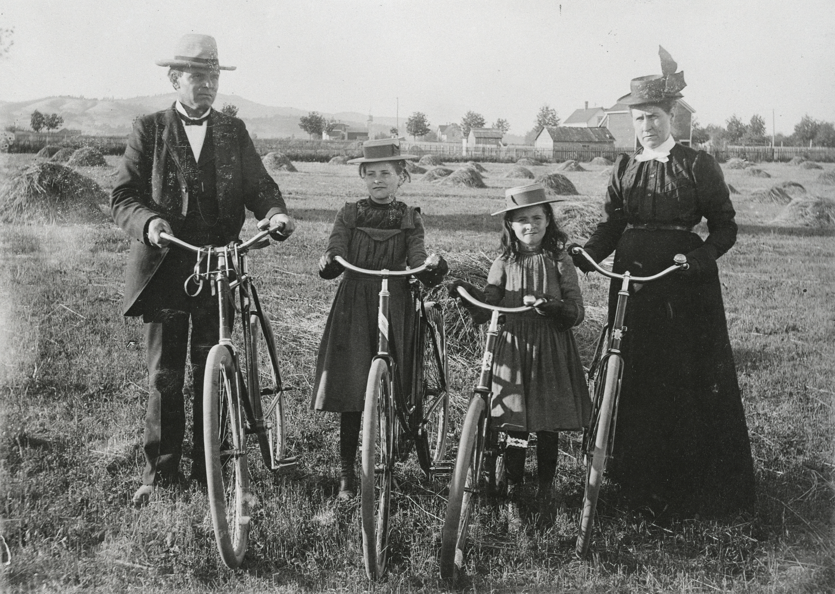 John B., Vera, Pearl, and Isabelle Horner on a bike ride, Corvallis, 1899.