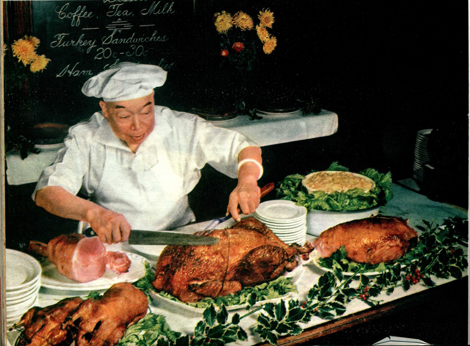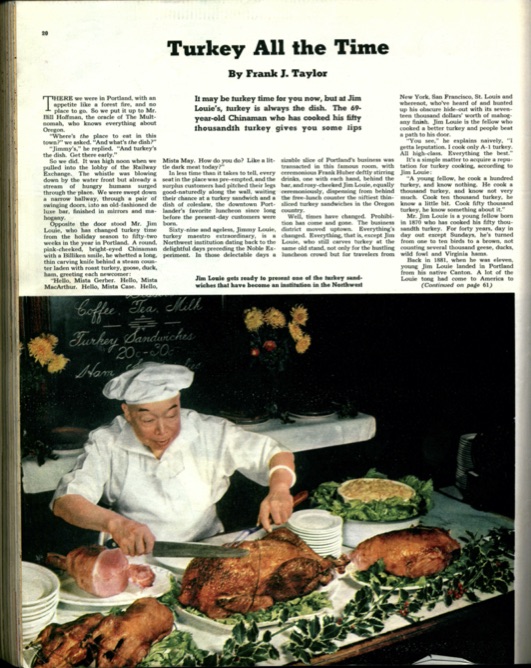 Huber’s survived Prohibition by converting to a full-time restaurant and supplementing profits through the sale of incognito drinks, including the now-legendary Manhattan cocktails disguised in coffee cups. In 1939, the restaurant gained a national reputation when writer Frank Taylor published a profile of Louie entitled “Turkey All the Time” in Collier’s Magazine. Despite the sympathetic portrayal of both Louie and the restaurant, however, racial stereotyping and the vernacular language used in the article demonstrate how prejudice was an obstacle for Chinese Americans.