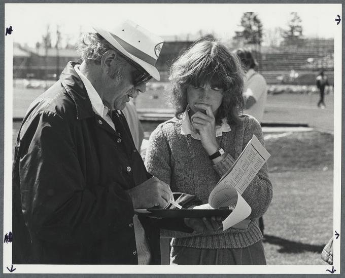 Assistant Coach Joni Huntley with Coach Will Stephens, Oregon State University, 1981.