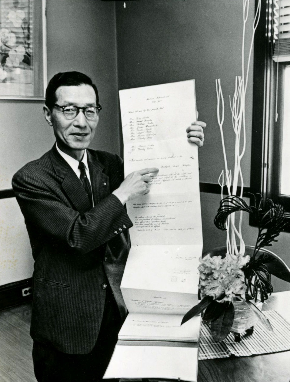 Japanese Counsel Katsuma Urabe holds the charter for the Portland chapter of Ikebana International, 1961.