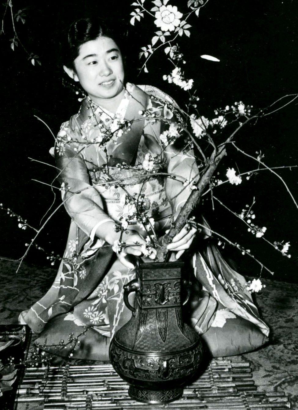 Kikusu Hasegawa holds an Ikebana demonstration using Portland roses, 1951.