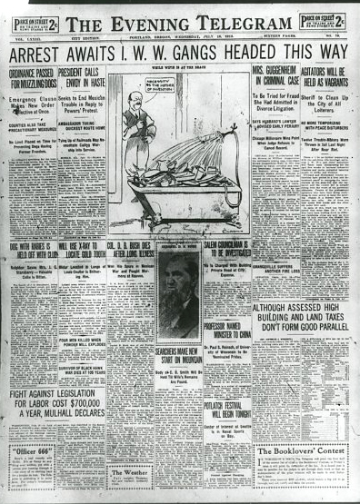 The IWW first appeared in Oregon in early 1907, when the union led a Portland parade of its members in protest against the trial of IWW leader William D. Haywood, who had been falsely charged with the 1905 murder of Idaho Governor Frank Steunenberg. Portland remained the center of IWW activity in Oregon, and members spoke on street corners to organize rural laborers who came to the city in the off-season or to find work from employers’ agents. The mainstream Portland unions affiliated with the American Federation of Labor (AFL) quickly distanced themselves from the IWW and its largely unskilled and itinerant constituency.