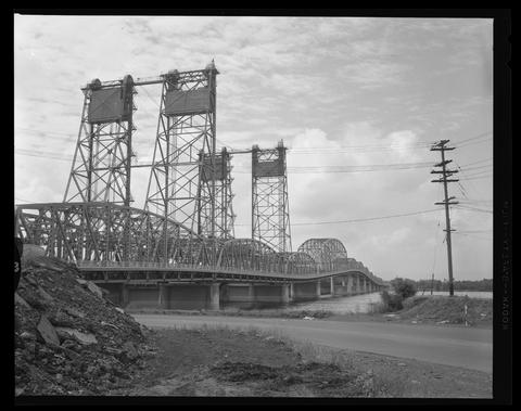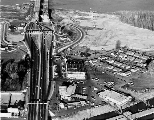 Aerial view of toll booths on Interstate Bridge approaches, 1959.