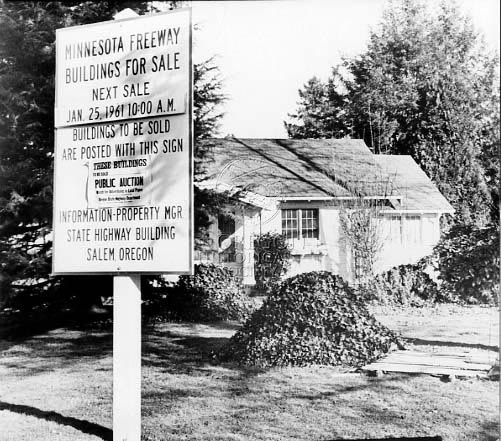 Sign informing of next public auction of buildings in the path of I-5, 1961.