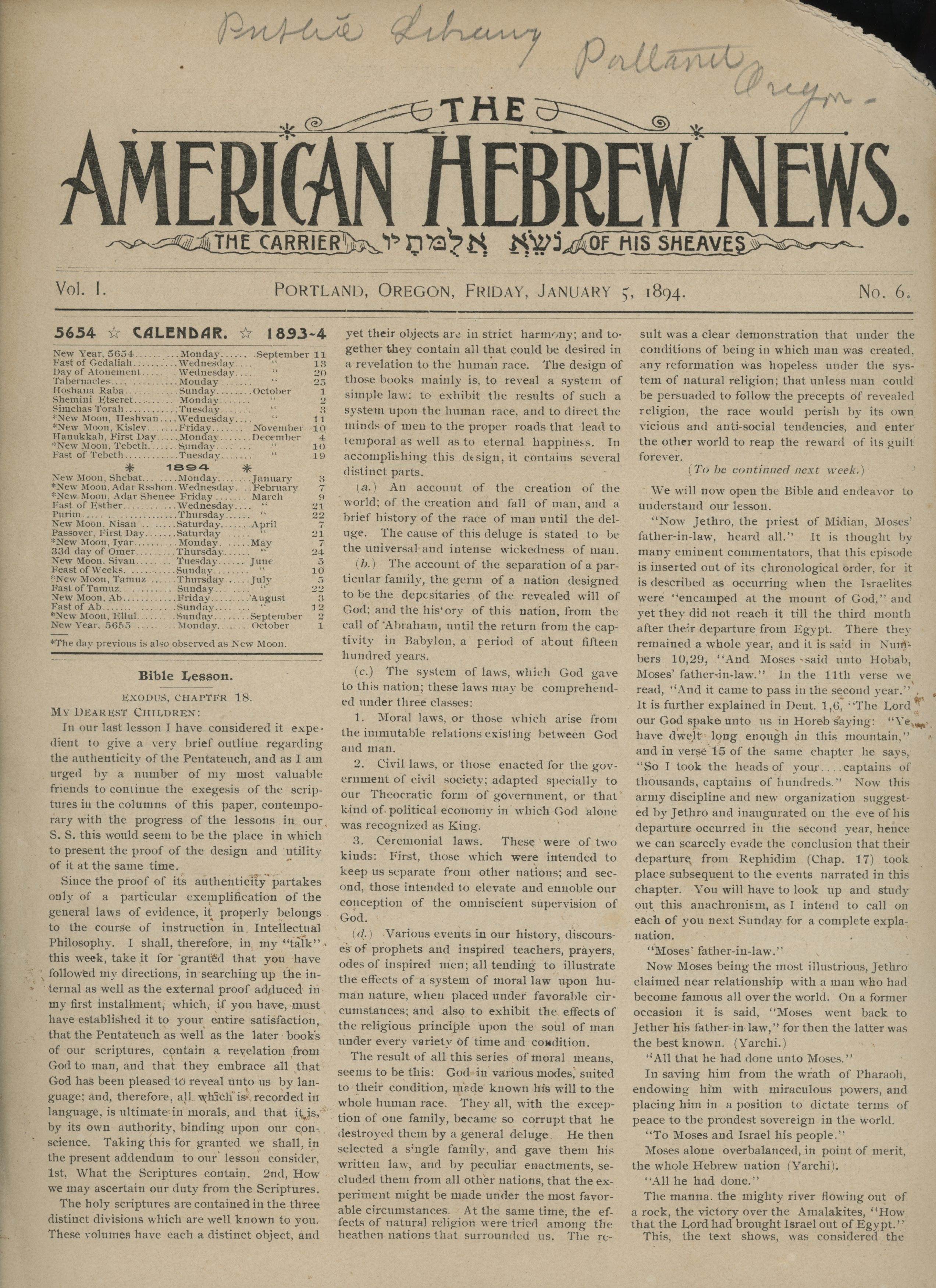 Front page of the American Hebrew News, Jan. 5, 1894, published in Portland.